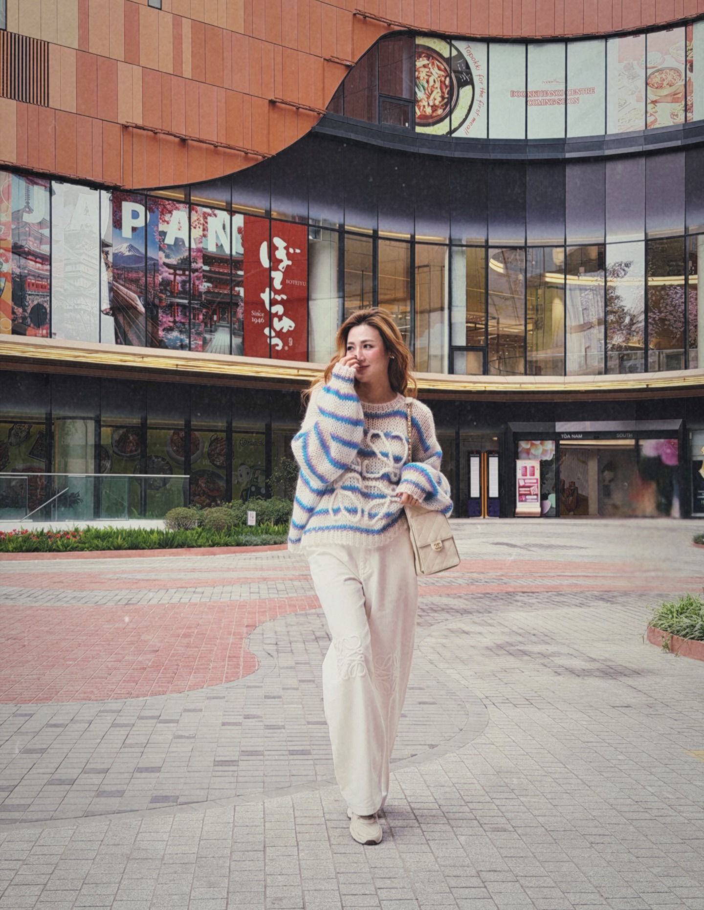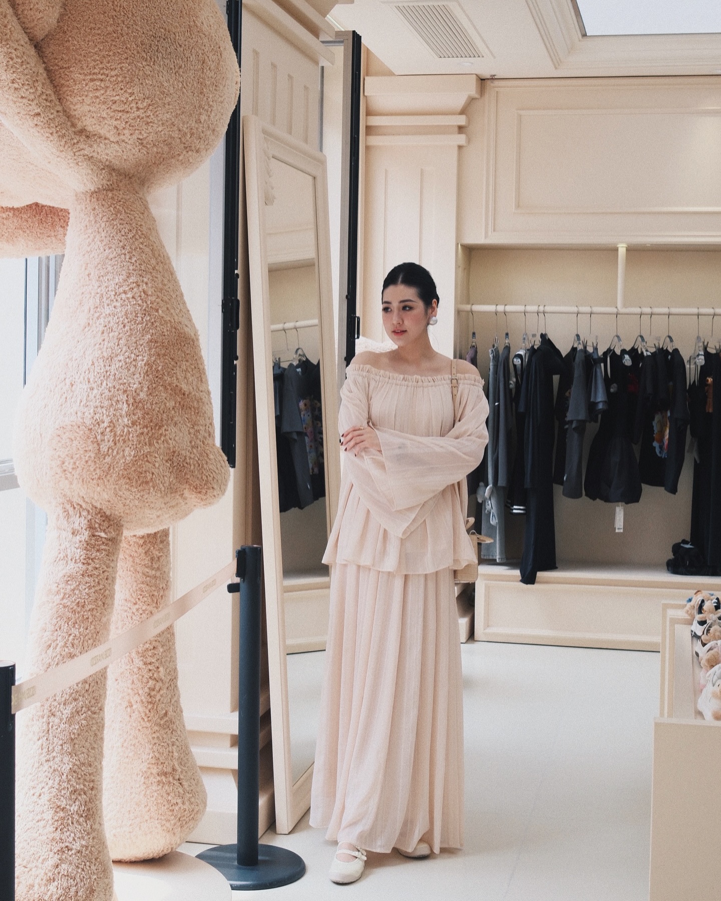 Phụ kiện đi kèm cũng được lựa chọn kỹ lưỡng. Giày mary jane mang lại nét cổ điển, sang trọng, trong khi vẫn giữ sự thanh thoát. Cô chọn kiểu giày cùng tông trắng dịu dàng để không phá vỡ sự hài hòa. Cách phối này đặc biệt phù hợp cho những buổi gặp gỡ gia đình, sự kiện nhẹ nhàng hoặc dạo phố cuối tuần.