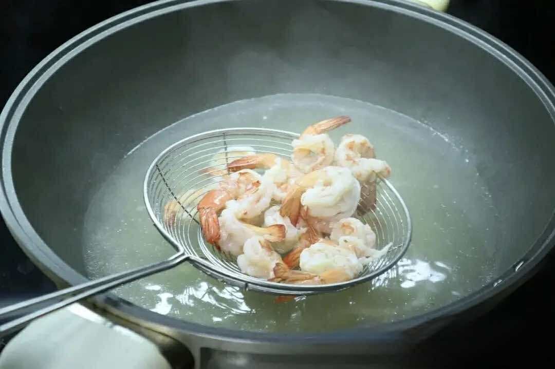 Bước 2: Đun sôi nước trong nồi, cho một ít muối và vài giọt dầu ăn vào. Sau đó thả bông cải xanh vào chần sơ. Khi nước sôi, vớt ra và xả một lúc dưới vòi nước lạnh. Sau đó tiếp tục chần ngô và vớt ra. Tiếp tục đun sôi nước trở lại, cho một ít rượu nấu ăn vào, sau đó thả tôm vào chần sơ đến khi tôm chuyển màu. Vớt tôm ra và để ráo nước.