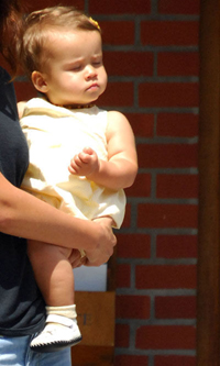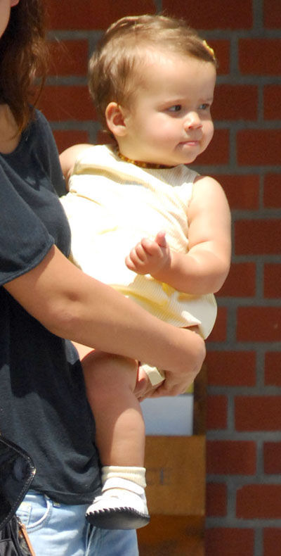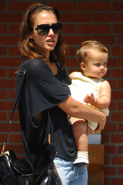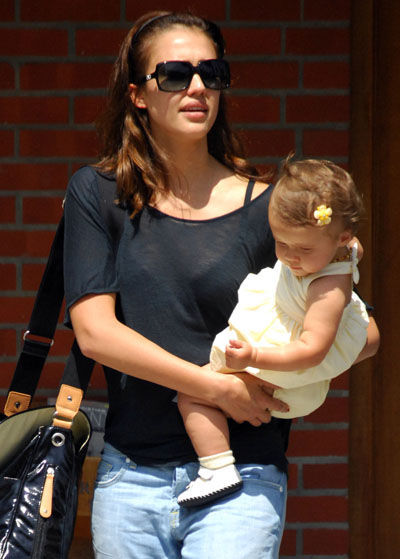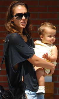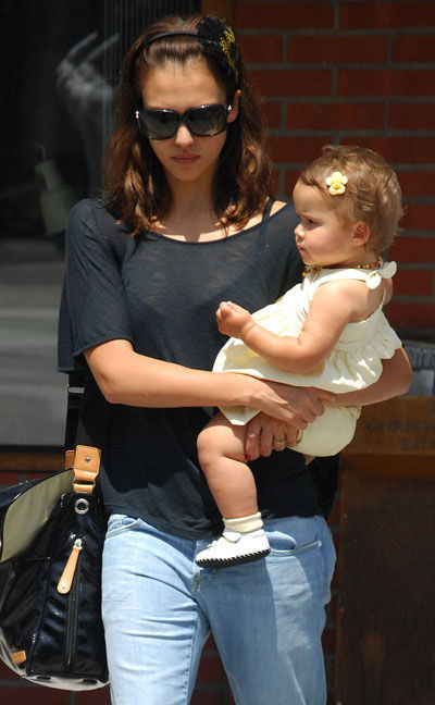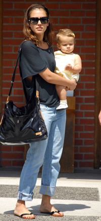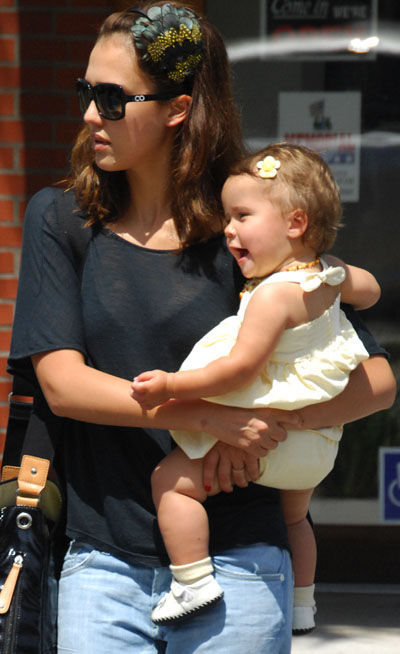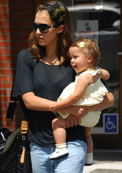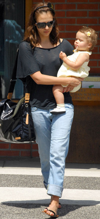 Jessica Alba mặc rất thoải mái, quần jean và áo rộng màu đen, bé con 10 tháng tuổi được mẹ cho diện chiếc váy trắng dễ thương và không quên đeo một bông hoa nhỏ trên tóc.