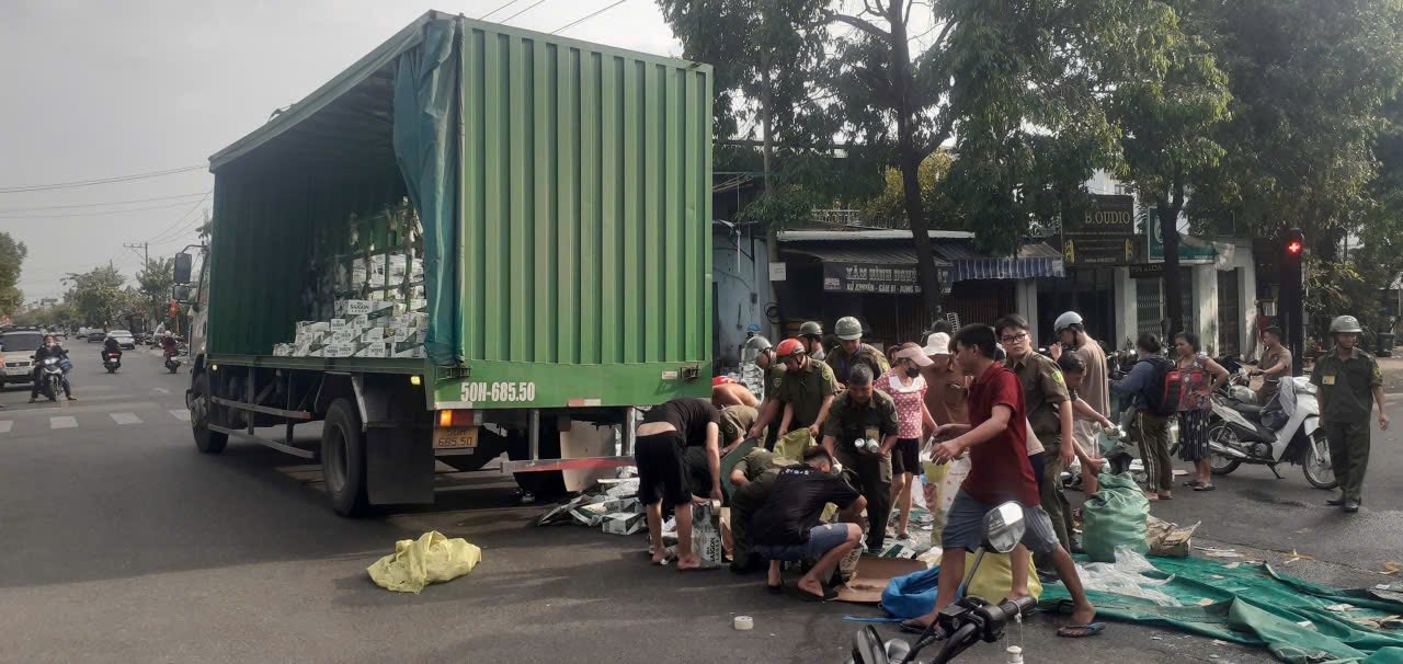 Theo ghi nhận ban đầu, xe tải chở bia lưu thông theo hướng từ chợ Phước Vĩnh đến ngã tư và quay đầu xe. Do mặt đường nghiêng, nhiều bia trên thùng xe bị rơi xuống lòng đường. Nhận tin báo, Công an xã Phú Giáo nhanh chóng có mặt điều tiết giao thông, cùng người dân hỗ trợ tài xế thu gom bia, dọn dẹp hiện trường.