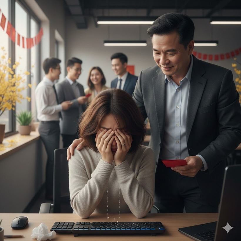 Đúng lúc ấy, sếp bước vào. Anh vẫn phong thái đĩnh đạc ấy, đi vòng quanh lì xì và chúc mừng năm mới từng người. Khi đến bàn tôi, thay vì đưa phong bao rồi đi tiếp như mọi năm, anh dừng lại một chút, nhìn sâu vào mắt tôi. Anh không hỏi về báo cáo, cũng không nhắc đến mục tiêu quý 1. Anh đặt nhẹ tay lên vai tôi, giọng trầm thấp nhưng ấm áp lạ thường.