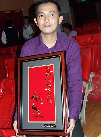 | Nghệ sĩ Hữu Lộc, cháu gọi NSƯT Thanh Nga là cô ruột, ôm bức họa thư pháp dâng lên người nghệ sĩ quá cố trong ngày giỗ thứ 30 năm của bà. Ảnh: Thoại Hà. |