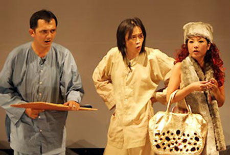 | Hữu Lộc (trái) diễn hài bên cạnh Hoài Linh và Thúy Nga. Ảnh: Thoại Hà. |