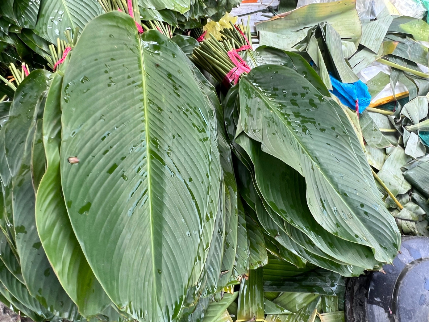 Lá dong được thu mua từ Đồng Nai, Lâm Đồng; lá chuối chủ yếu từ các tỉnh miền Tây, vận chuyển về trong ngày để đảm bảo độ tươi. Trong thời gian chờ khách, tiểu thương cắt xén để lá đẹp hơn, tưới nước để lá không bị héo.