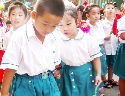 Còn bé Thuỳ Linh, học sinh trường tiểu học Thăng Long, thì được dự khai giảng từ sáng qua. Bé ríu rít khoe: “Các anh chị lớp trên phải vẫy hoa chào các em lớp một, là bọn con ấy, mẹ ạ. Các em lớp một cũng vẫy chào lại các anh chị. Bọn con cứ cầm cờ, cầm hoa vẫy mỏi hết cả tay mẹ ạ”.