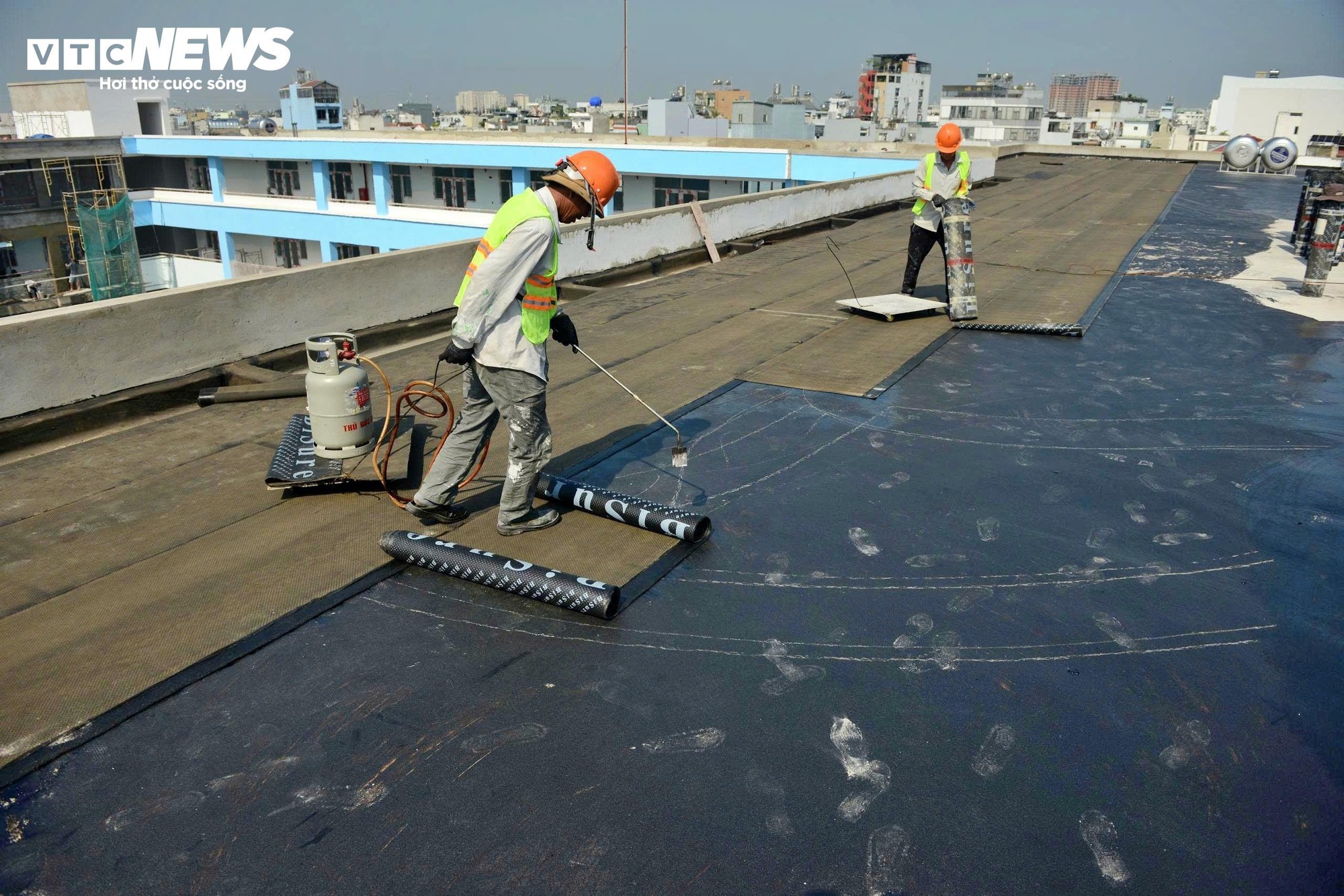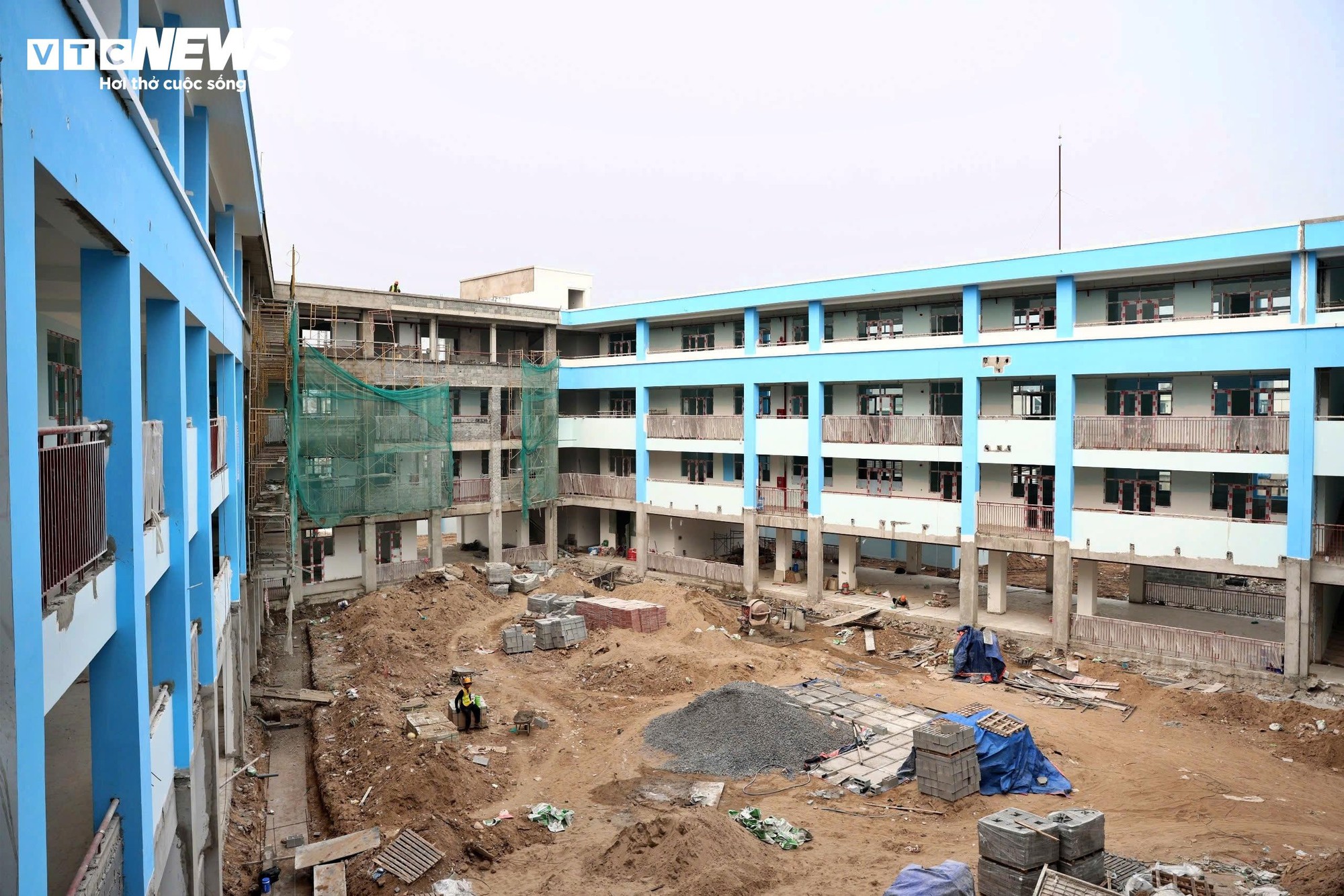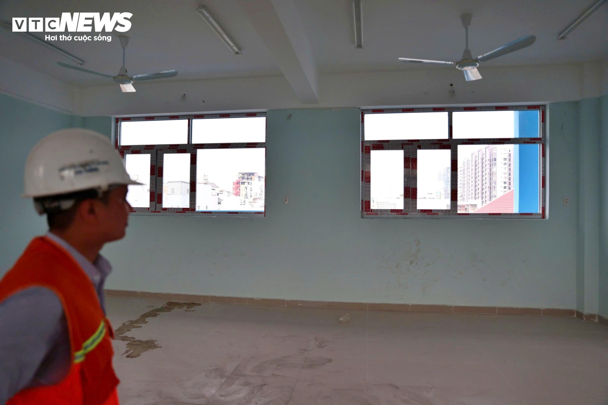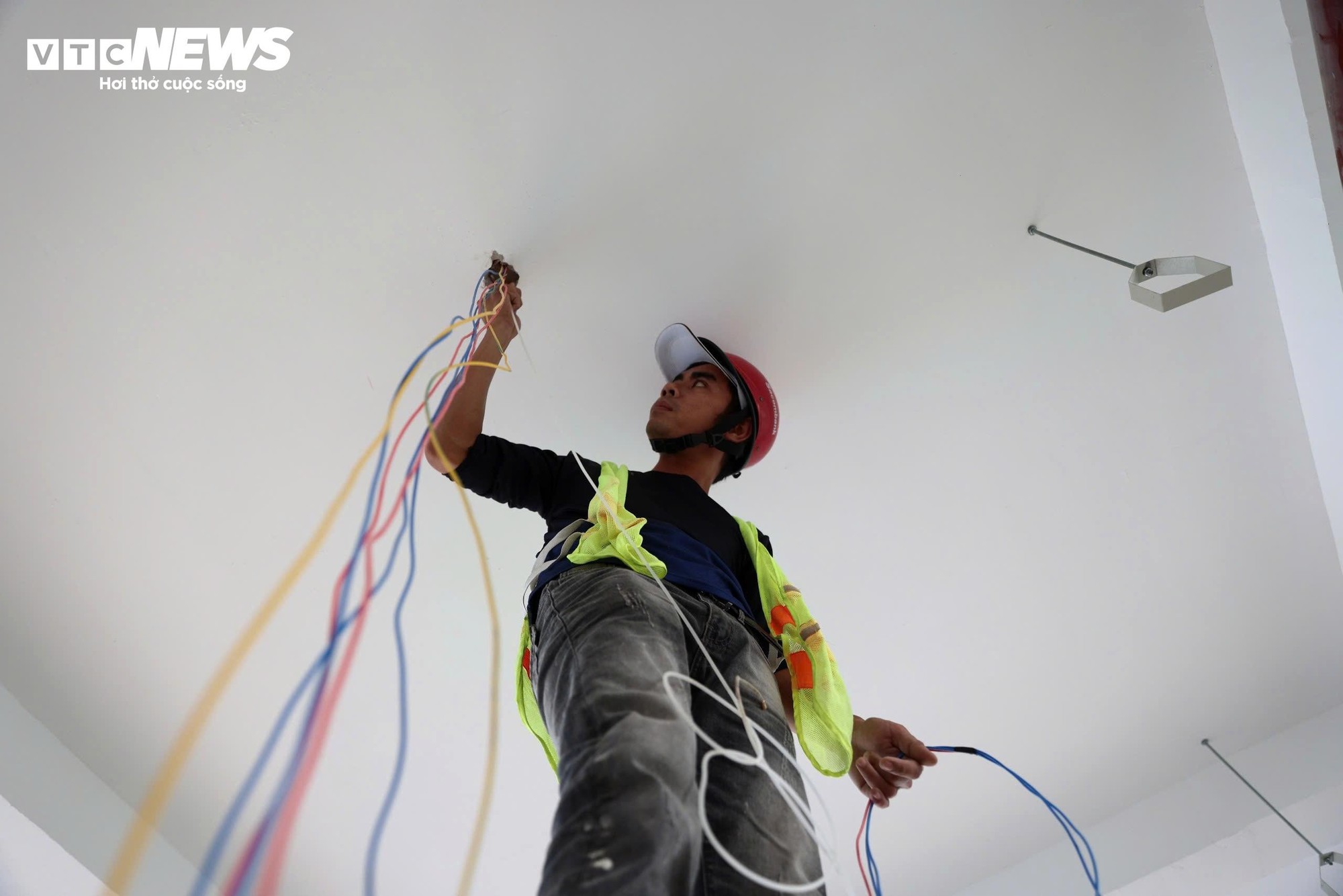 Khoảng 150 công nhân đang tập trung thi công đồng loạt các hạng mục. Nhiều dãy hành lang tại các tầng và trên sân thượng đang được công nhân tiến hành vệ sinh, hoàn thiện để chuẩn bị cho các bước thi công tiếp theo.