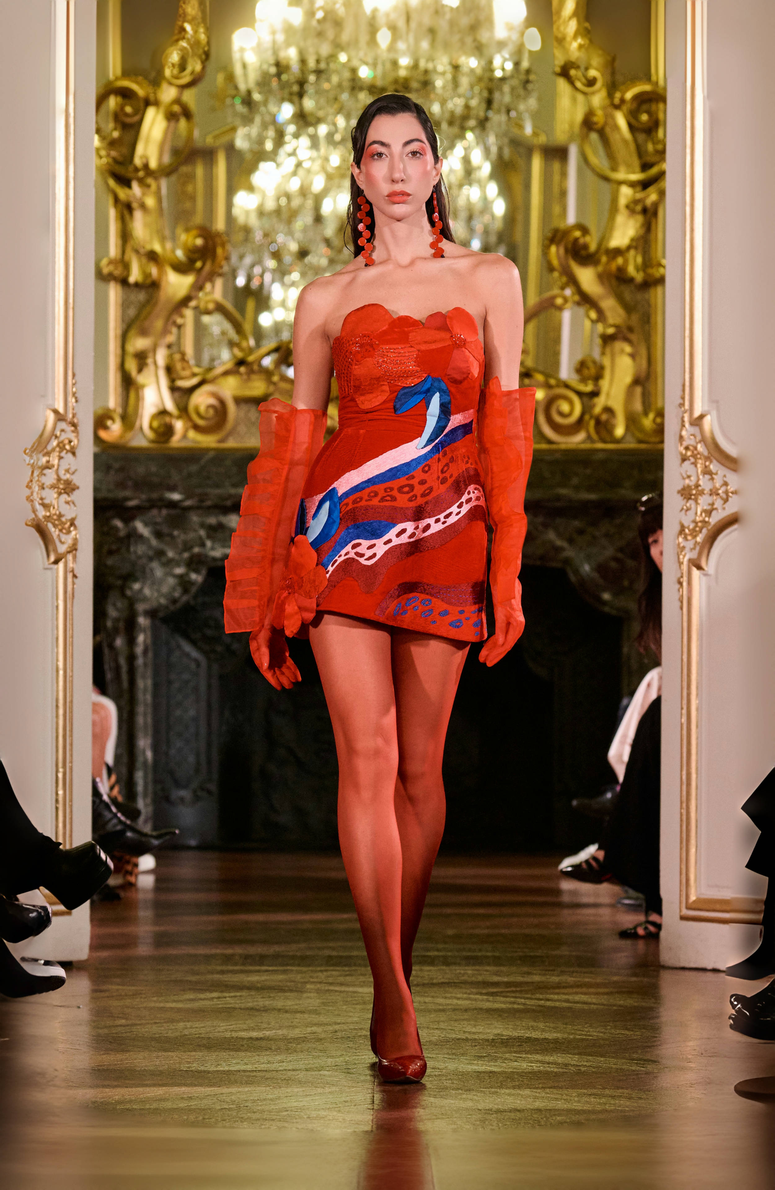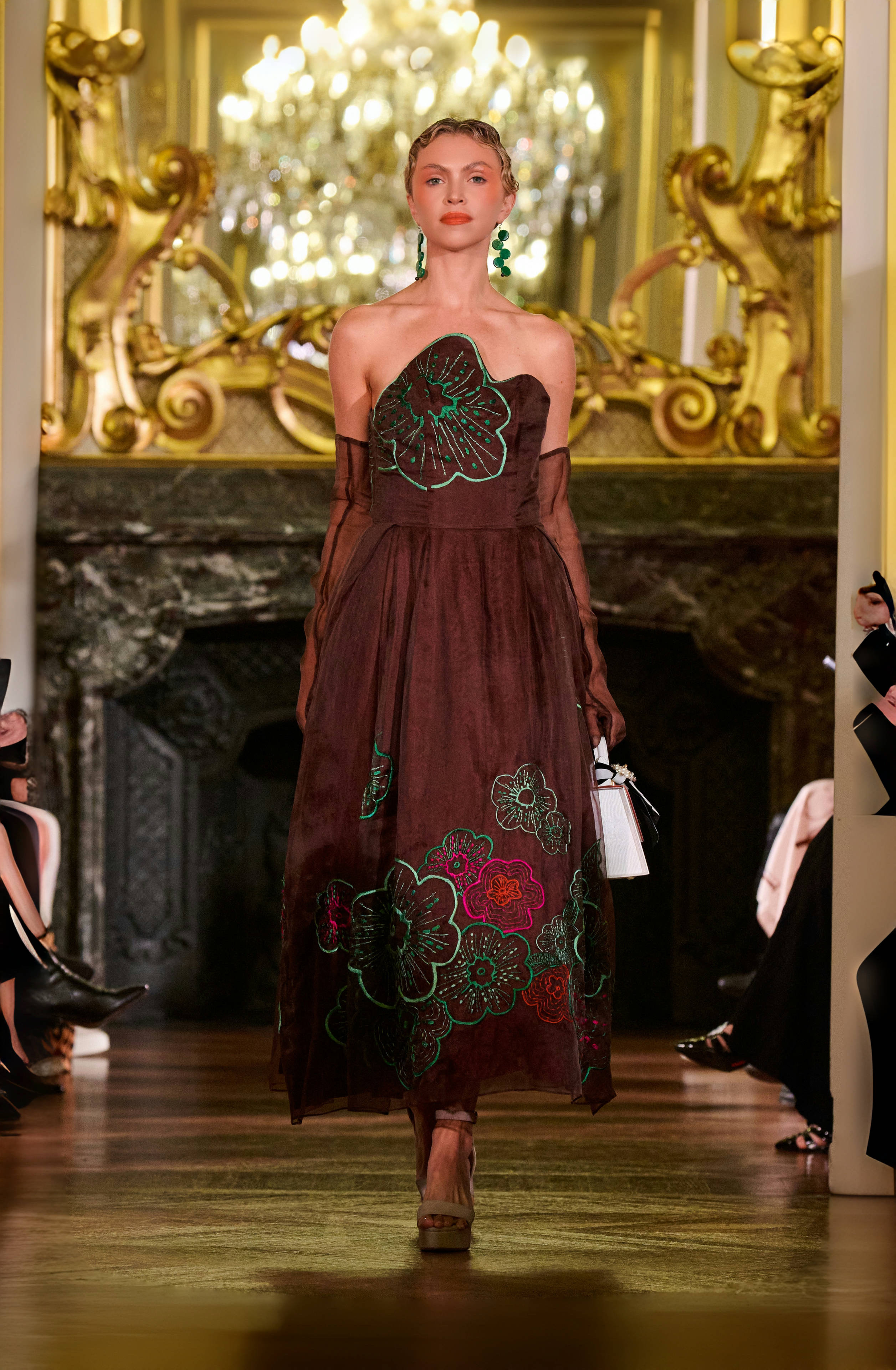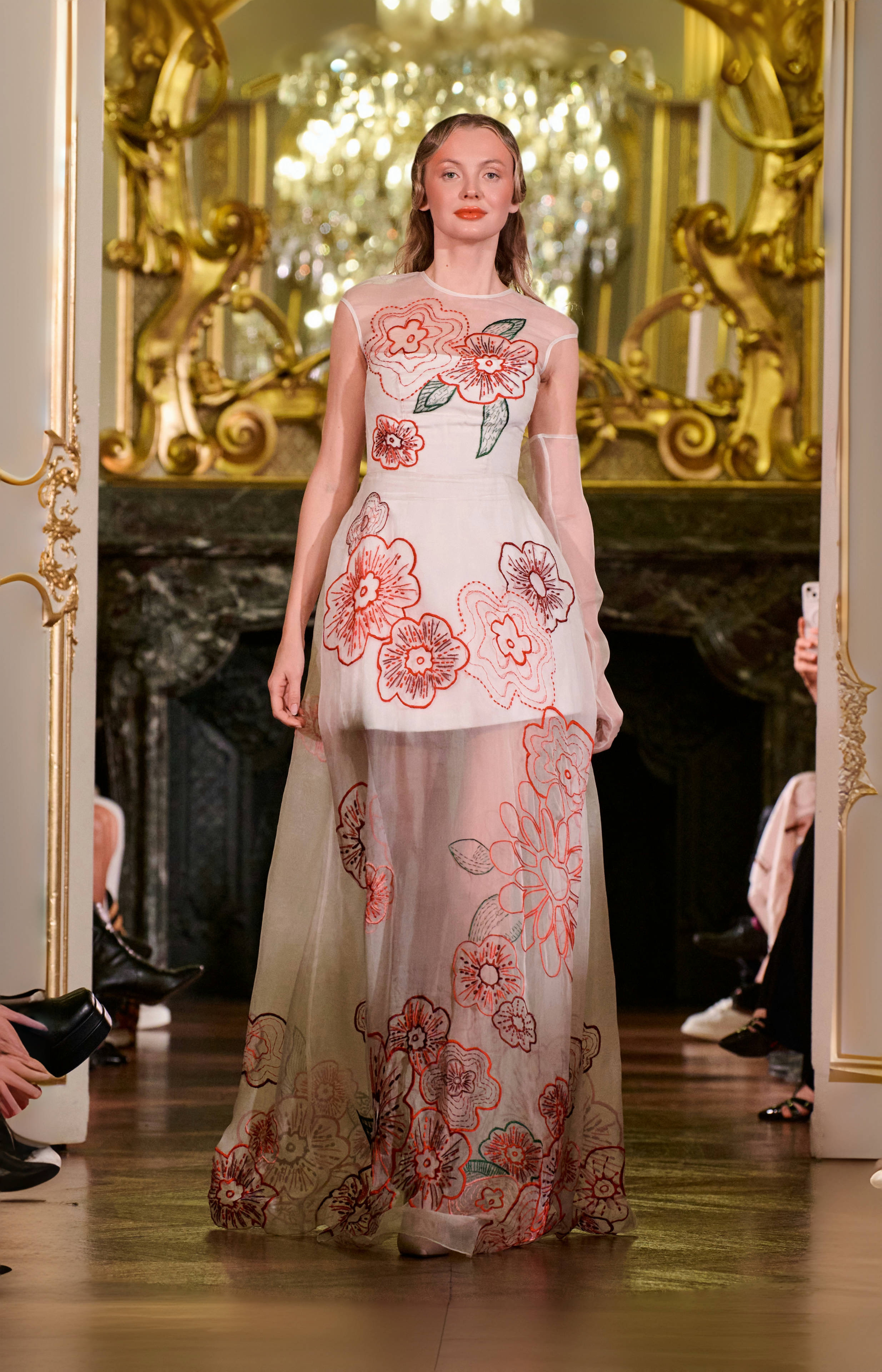 Không thể bỏ qua những họa tiết hoa như thược dược, hoa đào… mang đến sự lãng mạn, bay bổng cho ‘vườn địa đàng’ của Hà Linh Thư trong show diễn tại Paris. Những loài hoa này từng được chị khai thác trong rất nhiều bộ sưu tập trước đây, nhưng lần này, chúng lại rực rỡ và mãnh liệt hơn bao giờ hết khi được thể hiện với các tone màu nổi bật cùng kỹ thuật thêu thủ công, tỉ mỉ.