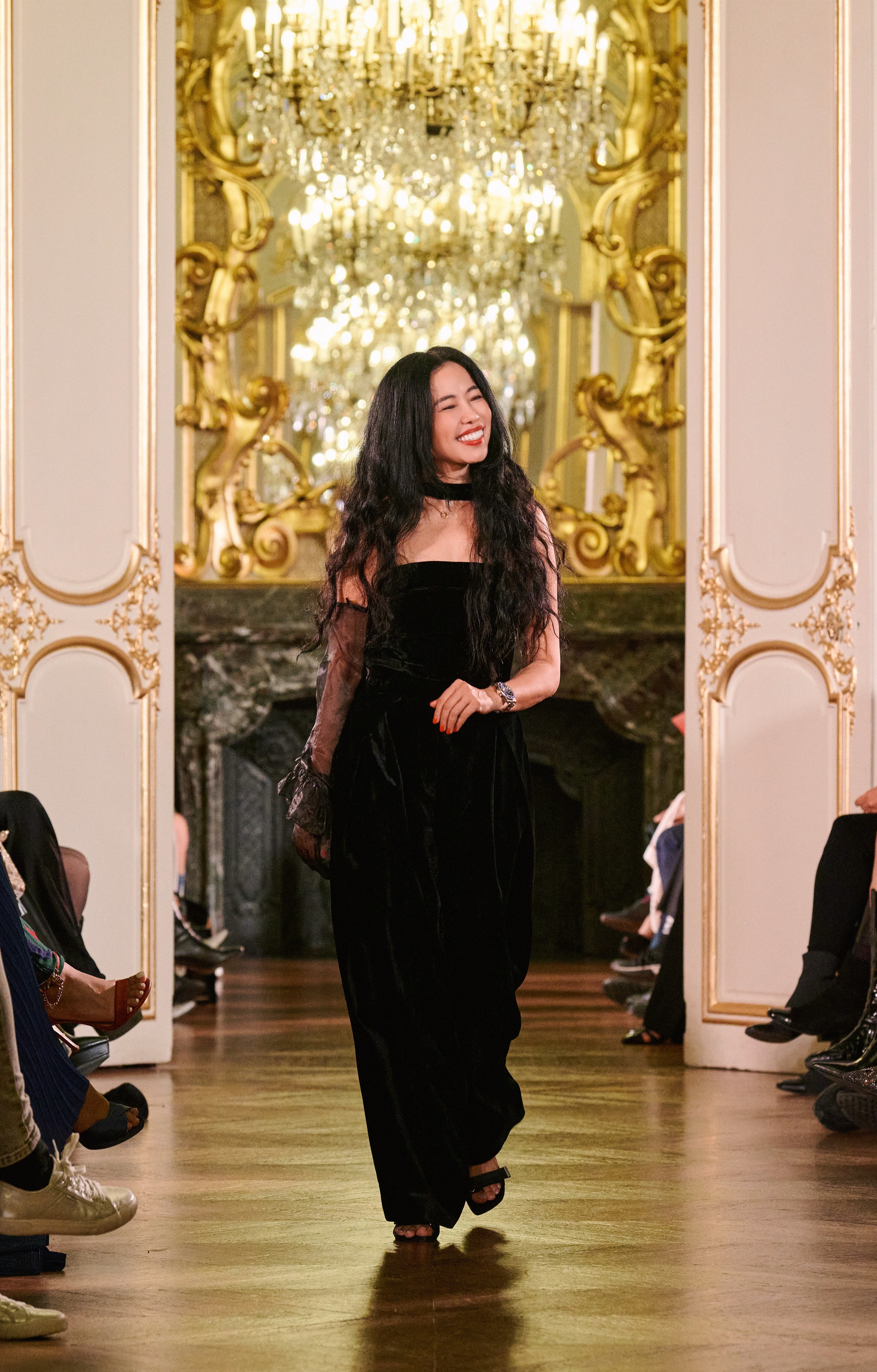 Một mình Quán quân The Face Việt Nam 2022 - Tú Anh, dạo bước trước dàn mẫu quốc tế tại show diễn của NTK Hà Linh Thư tại Kinh đô thời trang Paris.