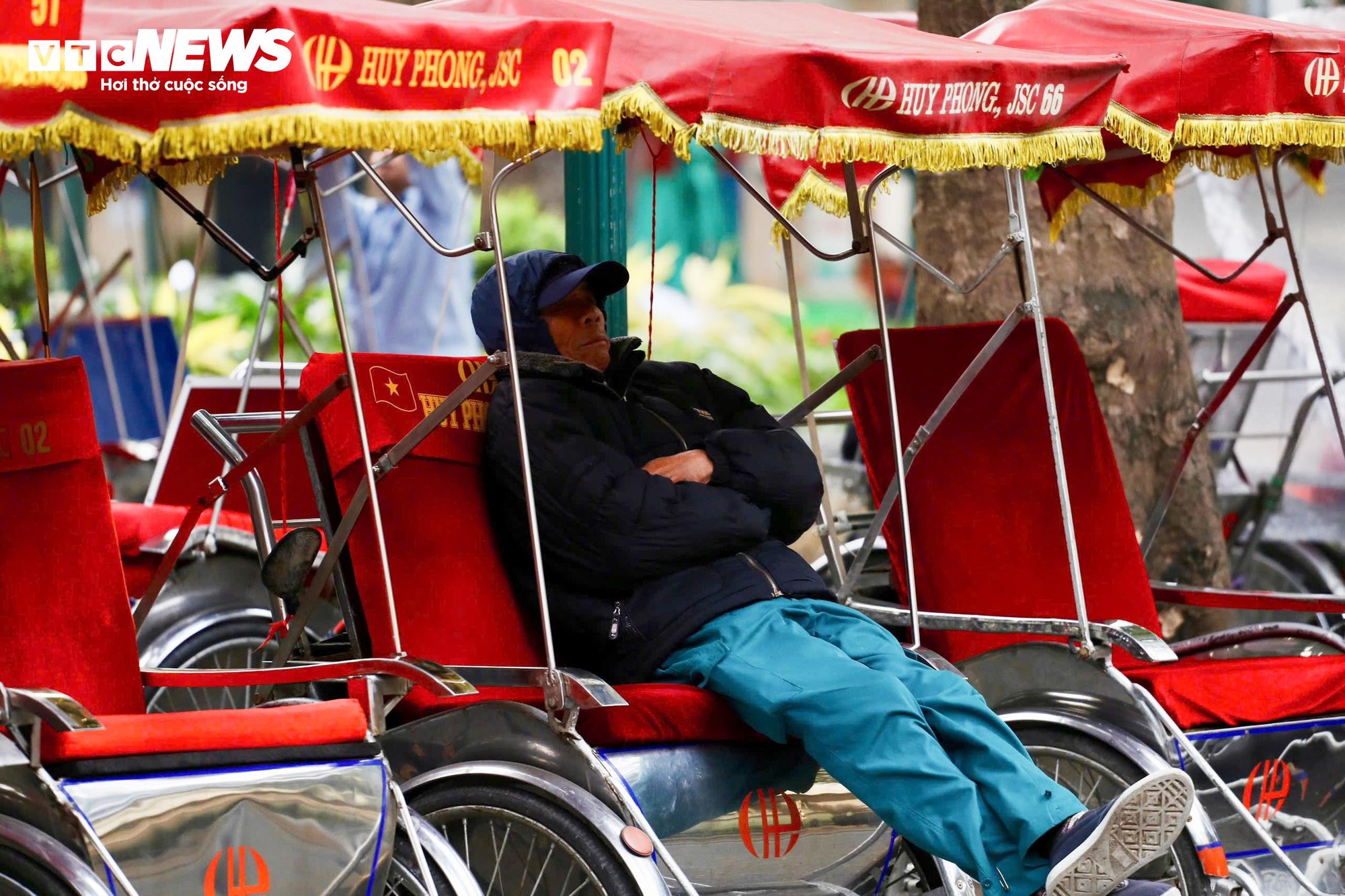 Người đàn ông co ro, khoanh tay để giữ ấm khi chưa có khách.