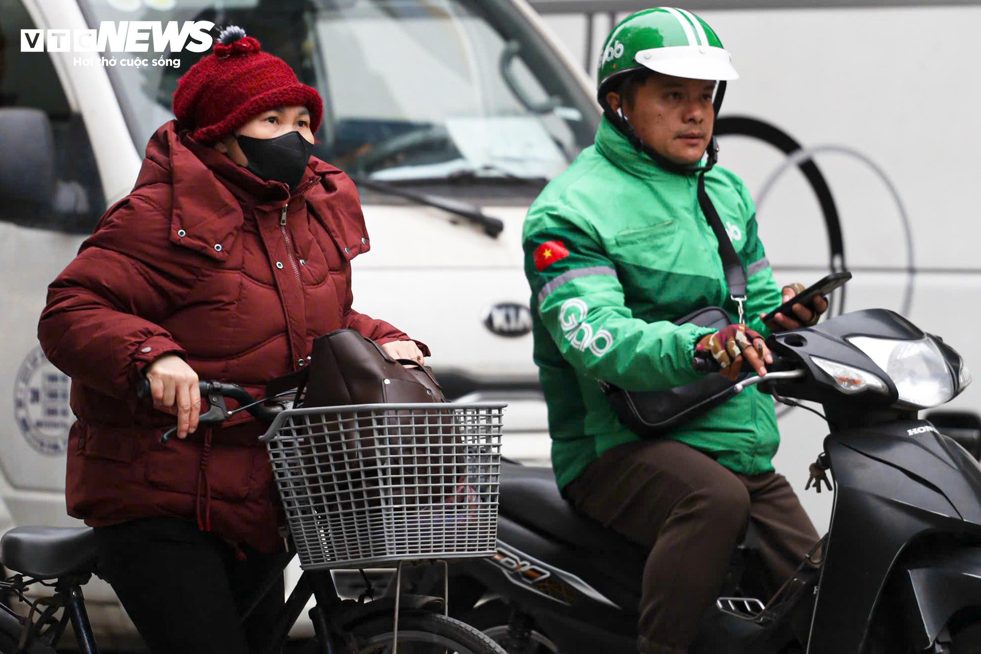 Không khí lạnh tràn về, Hà Nội chuyển rét rõ rệt trong sáng 2/1, nhiều người ra đường sớm phải khoác áo mưa, mặc thêm áo ấm để chống gió lạnh.