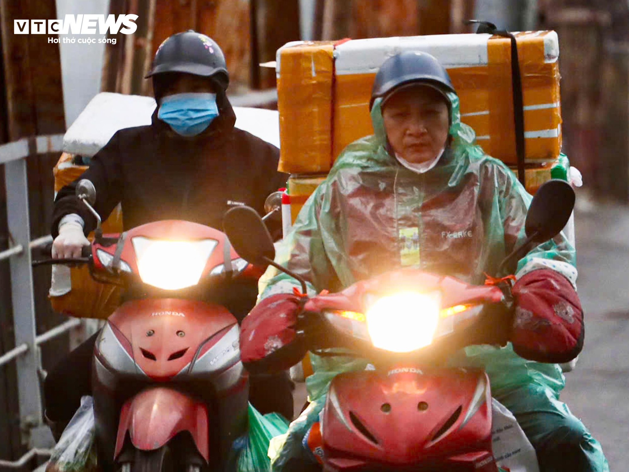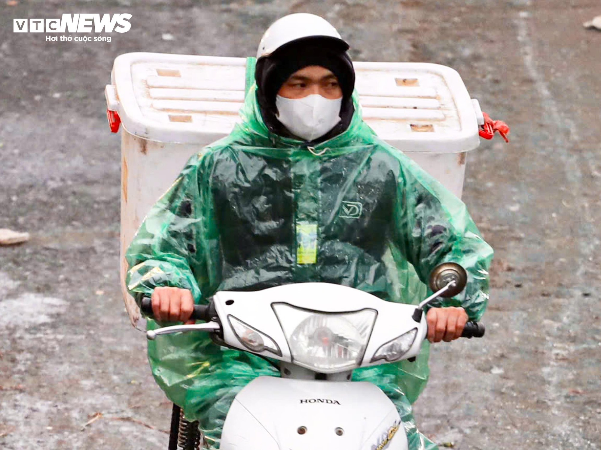 Ra đường từ sáng sớm, ngoài nhiều lớp quần áo, không ít người mặc thêm áo mưa như các giữ ấm tạm thời.