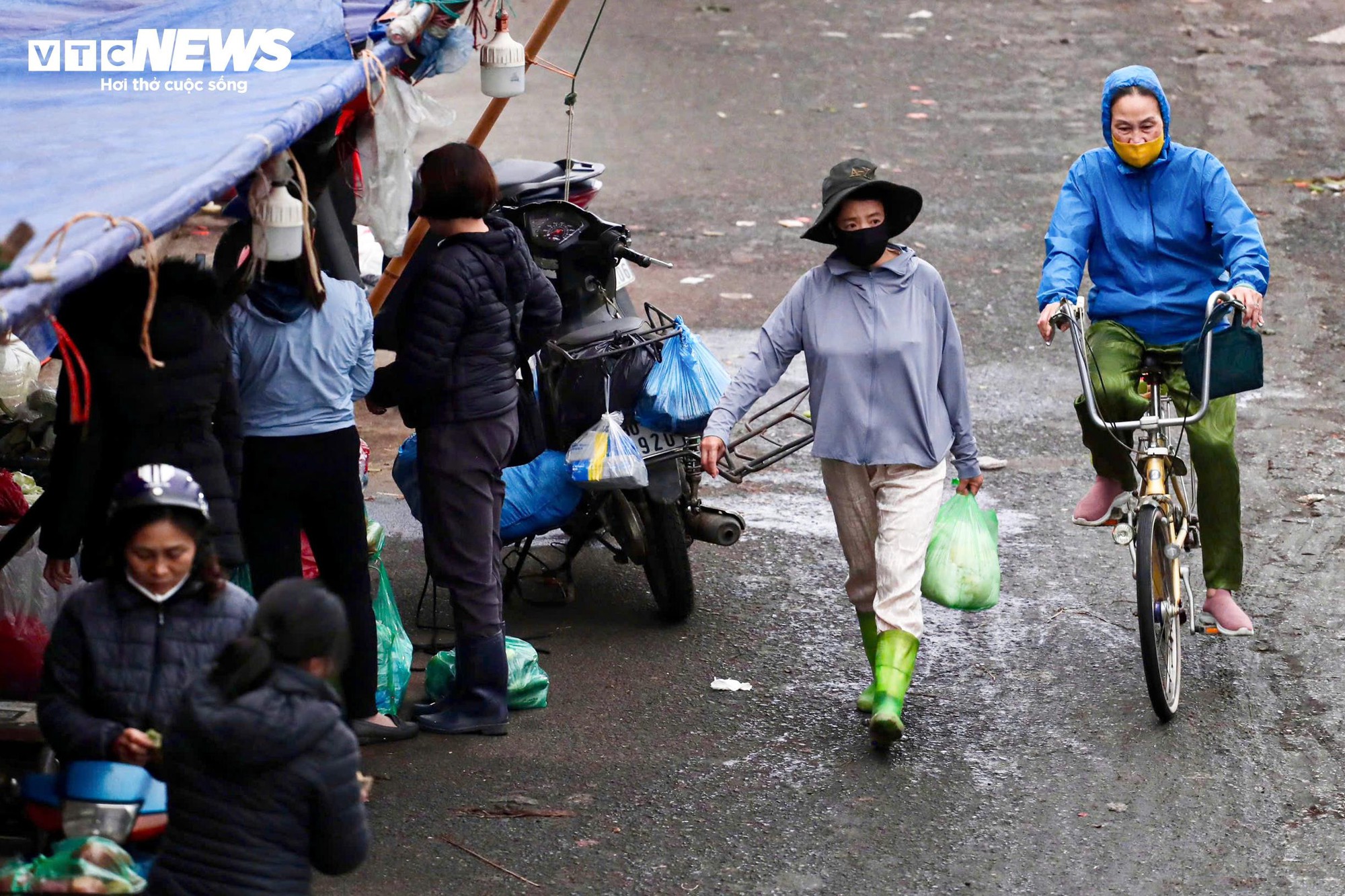 “Sáng nay lạnh hơn mấy hôm trước. Trời có mưa nhẹ nhưng gió khá buốt, nên tôi mặc áo mưa từ sớm cho đỡ lạnh, nhất là khi chạy qua cầu”, chị Lan Anh, tiểu thương chợ Long Biên chia sẻ.