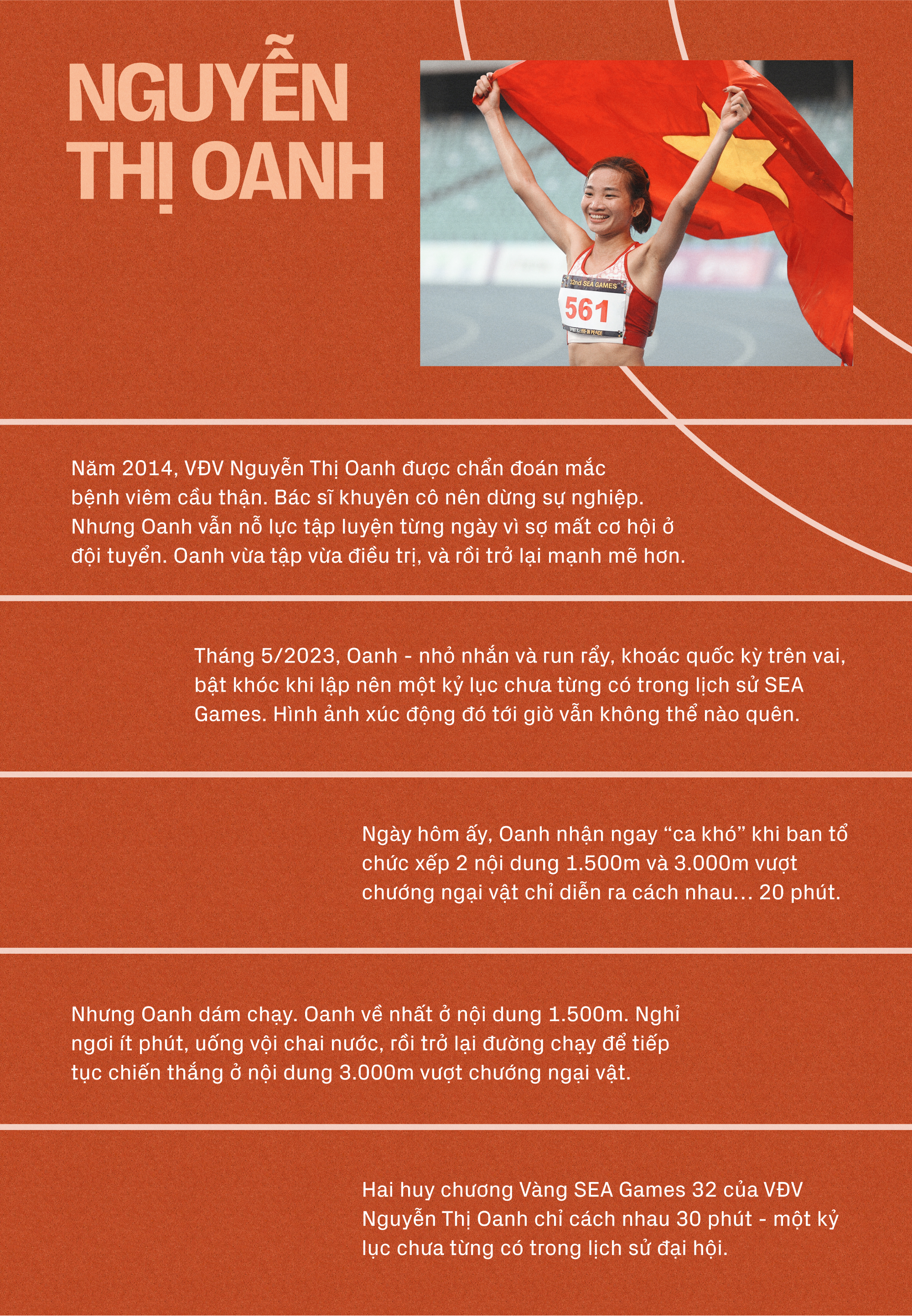 Cái Oanh bé xíu đó là Nguyễn Thị Oanh, vận động viên làm nên kỳ tích lịch sử chưa từng có ở SEA Games 32, cô gái tới gần năm 30 tuổi vẫn chỉ biết mỗi đường chạy và niềm vui đem nhà mới về cho bố mẹ.