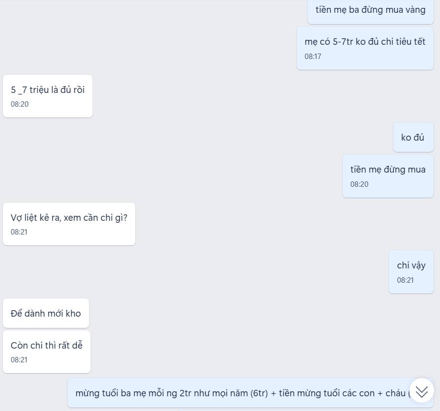 Cô vợ tiết lộ: “Nhà em, chồng thu nhập 50 triệu, vợ thu nhập 15 triệu. Mỗi tháng tiết kiệm 1 chỉ vàng, Tết này chồng em bảo chi 10 triệu thôi, tiêu thì dễ chứ tiết kiệm mới khó”.