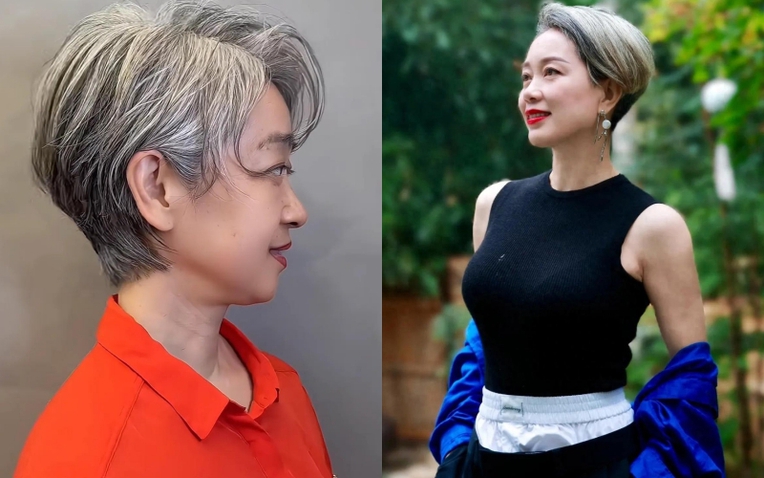 Kiểu tóc này được cạo gọn bốn phía, vừa tạo cảm giác sạch sẽ, dứt khoát, vừa làm giảm đáng kể cảm giác “lộ” tóc bạc về mặt thị giác. Đồng thời, kiểu tóc mang lại vẻ cá tính, phóng khoáng rất rõ rệt. Phong cách bất đối xứng tạo cảm giác cool, khác biệt. Phần tóc trên đỉnh chỉ cần rẽ lệch sang một bên, gần như không cần cầu kỳ khi tạo kiểu. Với phụ nữ có nhiều tóc bạc, nên ưu tiên những kiểu tóc ngắn mang hơi hướng cá tính, mạnh mẽ – như vậy mới biến mái tóc bạc vốn bị xem là “già” thành một dấu ấn thời trang.
