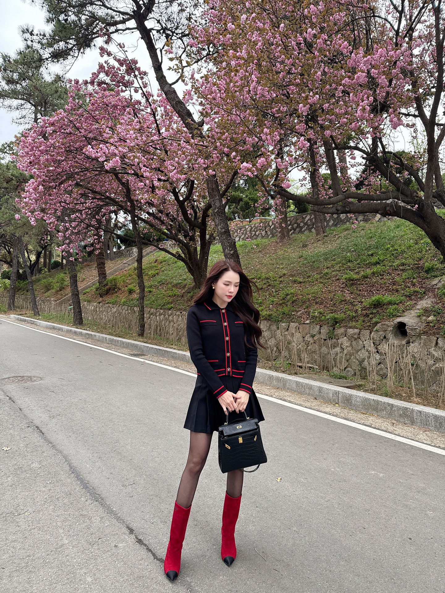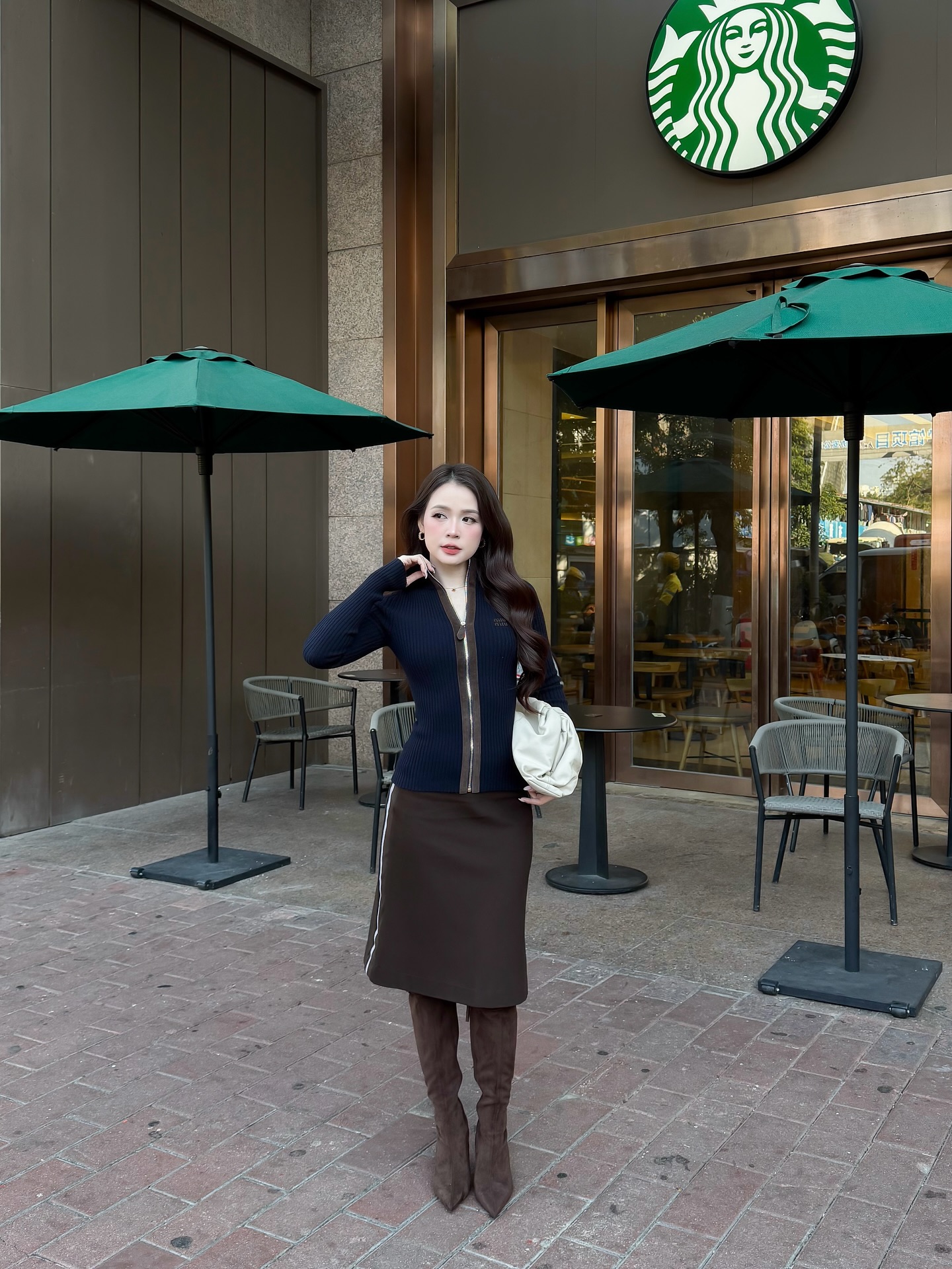 Điểm hay trong cách phối của Sam là luôn tạo được tỷ lệ cơ thể cân đối. Cô thường sơ vin gọn gàng, thắt thêm thắt lưng bản vừa để tạo vòng eo rõ ràng, giúp tổng thể trông cao ráo hơn. Khi đi cùng boots cao gót hoặc giày mũi nhọn, chân váy lửng không những không "dìm tuổi" mà còn mang lại vẻ ngoài hiện đại, rất phù hợp với môi trường công sở lẫn dạo phố.