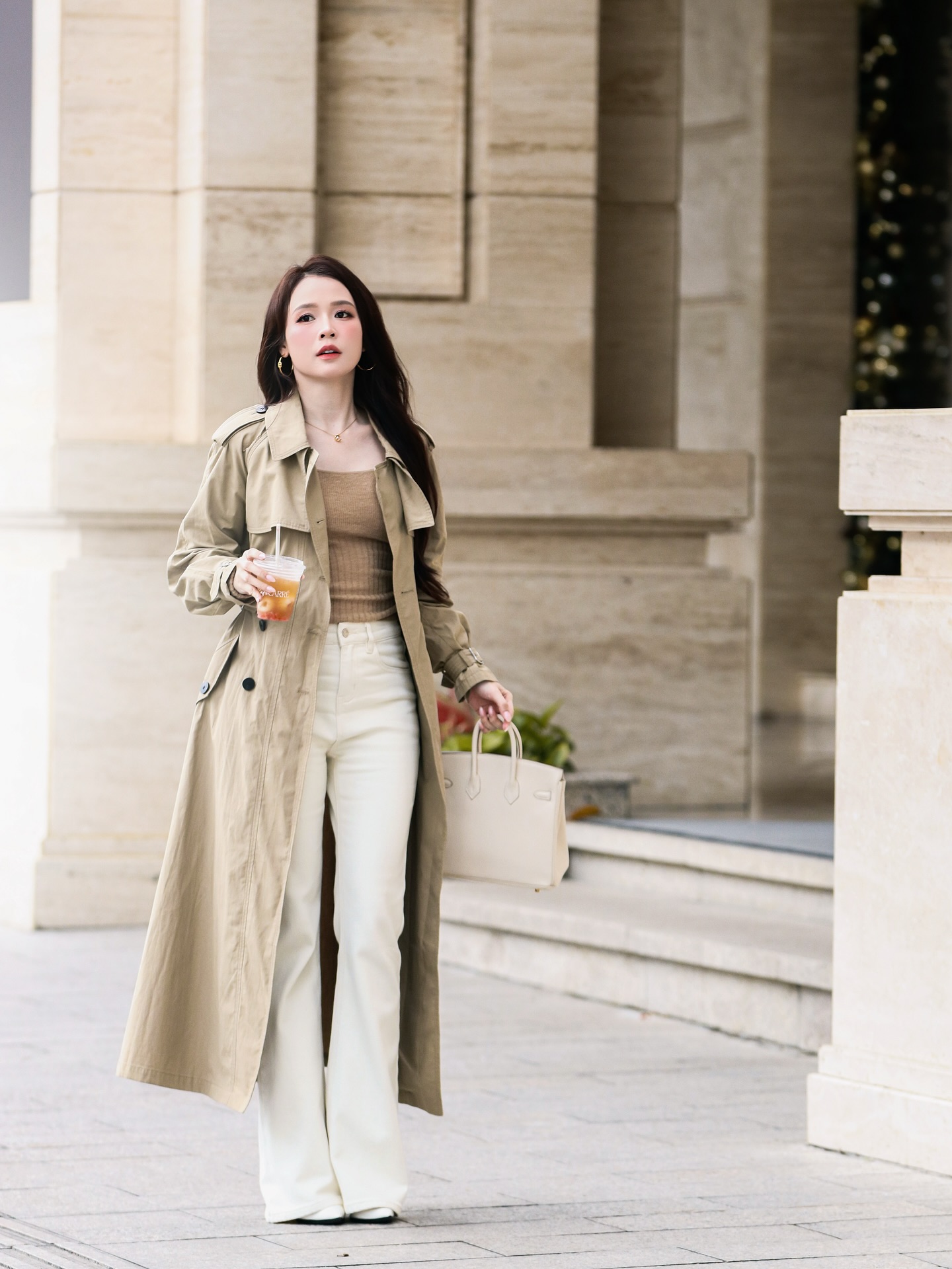 Cách phối này giúp tổng thể không bị nặng nề mà vẫn giữ được sự thanh lịch. Khi đi cùng giày trắng cao gót, trench coat không chỉ mang đến vẻ ngoài sang trọng mà còn tạo cảm giác hiện đại, trẻ trung, rất phù hợp với những buổi dạo phố hay cà phê cuối tuần.