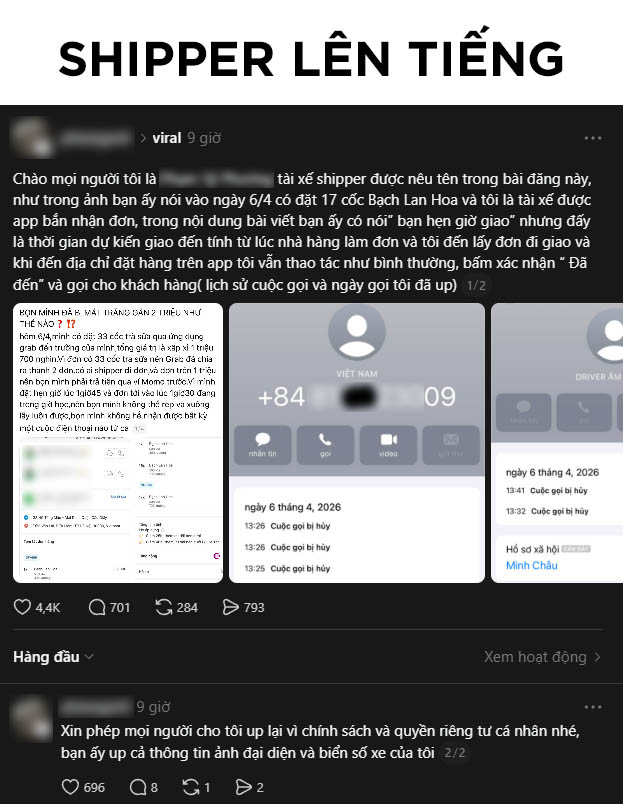 Trong bài đăng của mình, nhóm học sinh cho hay đã chọn chế độ hẹn giao hàng vào lúc 13h45. Tuy nhiên shipper đến lúc 13h30, trong giờ học nên các em không thể trả lời và xuống lấy hàng. Ngoài ra, nhóm cũng khẳng định rằng không nhận được bất kỳ một cuộc điện thoại nào từ phía shipper mà chỉ nhận tin nhắn thông báo qua ứng dụng.