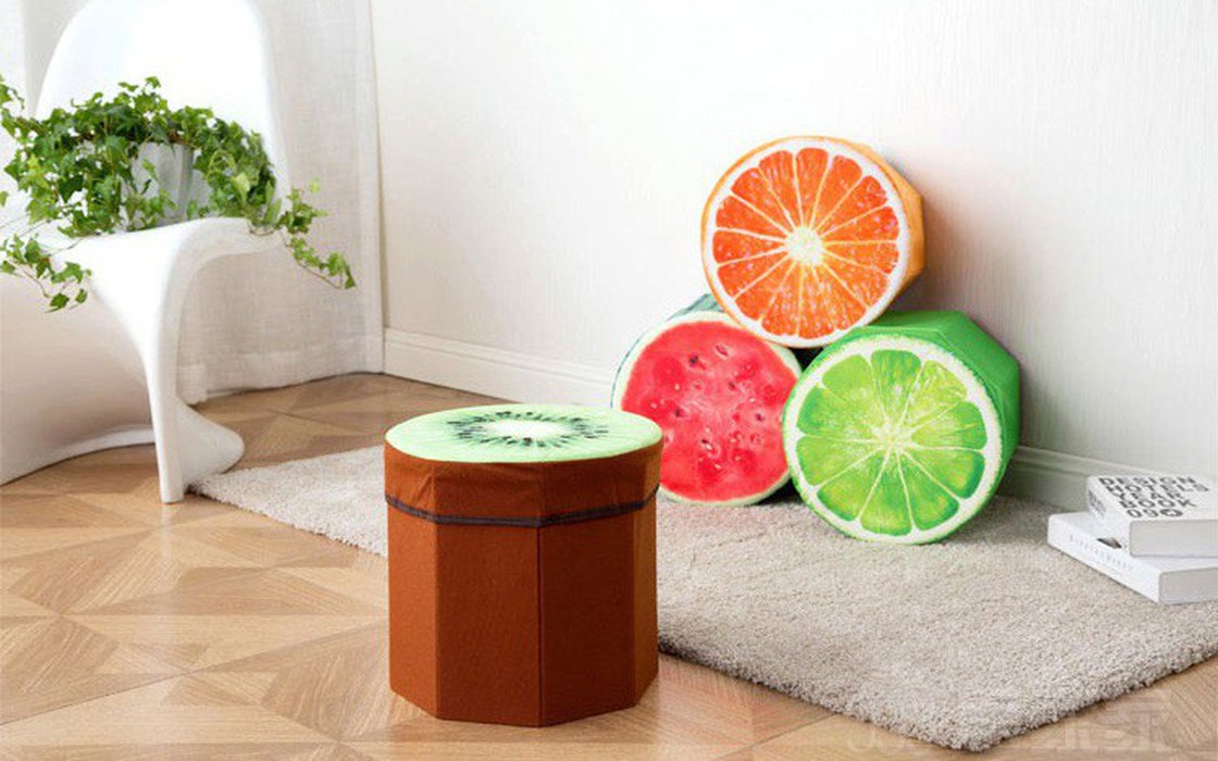 Bạn đã từng bao giờ nghĩ những chiếc ghế thô cứng khi kết hợp với ý tưởng dáng hình của hoa quả sẽ trở nên đáng yêu như thế nào không? Với chủ đề hoa quả đẹp mắt, chiếc ghế ngồi được khoác lên mình chiếc áo của quả kiwi thanh mát, dưa hấu ngọt lịm, chanh tươi xanh và cam vàng mọng nước. Tương tự như mẫu ghế thứ hai, chúng cũng được thiết kế với phần ruột rỗng để tăng cường khả năng lưu trữ. Khi không sử dụng, những chiếc ghế trở thành vật trang trí xinh yêu cho căn phòng thêm bắt mắt. Sản phẩm được làm bằng bìa carton cứng và vải không dệt, kích thước 30 x 29 x 28cm, trọng lượng gần 1kg. Giá tham khảo: 90.000 đồng/ chiếc.