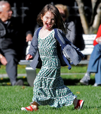 Suri cười hớn hở chạy chơi trên bãi cỏ công viên. Bé mặc chiếc váy dài nhiều tầng màu xanh và đi đôi giày vải đỏ vô cùng đáng yêu. Katie Holme tự hào khoe con gái rất biết làm điệu: “Con bé thích ngồi trong lòng tôi trước bàn trang điểm”