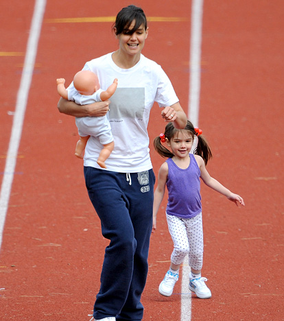 Suri buộc tóc hai bên thật dễ thương, mặc chiếc quần legging chấm bi, áo ba lỗ màu tím và đi giày thể thao. Bé chạy thể dục cùng mẹ và đến thăm bố ở phim trường, gần đây Suri thường mang theo búp bê em bé có vẻ cô bé đã sẵn sàng “lên chức” chị.