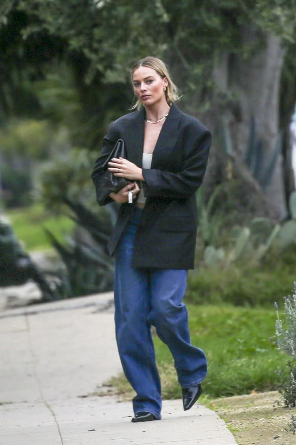 Cô kết hợp quần jeans ống rộng với áo blazer oversized, phiên bản đen hoặc xám. Bên trong áo blazer dáng rộng, Margot Robbie diện áo tank top và sơ mi, hay áo crop top. Tất cả đã tạo nên tổng thể hài hòa, nhưng vẫn toát lên nét sang chảnh, thời thượng. Bí kíp để giúp set áo blazer và quần jeans trở nên long lanh hơn của Margot Robbie chính là tô điểm phụ kiện vàng. Ngoài ra, một đôi giày như giày da màu đen, hay giày cao gót mũi nhọn tông đỏ nâu chính là những lựa chọn lý tưởng để đảm bảo độ "xịn" cho cả tổng thể trang phục.