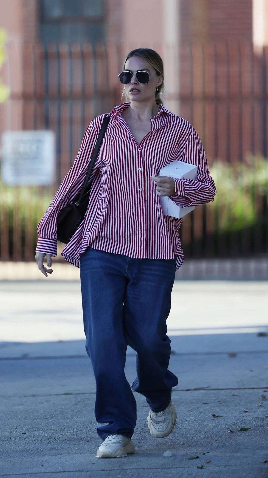 Quần jeans và áo sơ mi luôn là "cặp bài trùng" hoàn hảo. Sự kết hợp giữa hai item cơ bản này sẽ tạo nên bộ cánh đan xen giữa nét thanh lịch và sự cá tính, trẻ trung. Thay vì giới hạn phong cách bằng những mẫu áo sơ mi cơ bản, Margot Robbie có các lựa chọn đa dạng hơn, chẳng hạn như áo sơ mi denim, hay áo sơ mi họa tiết kẻ mang tông màu hồng và trắng làm chủ đạo.