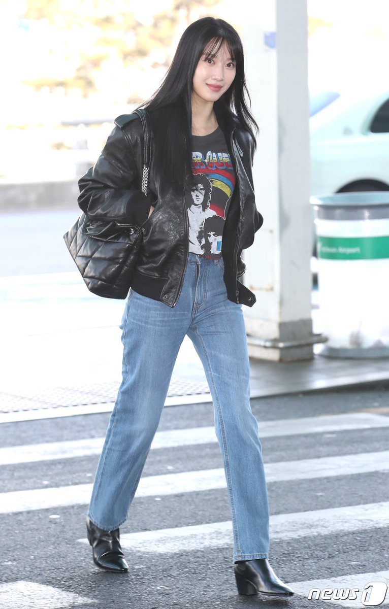 Bên cạnh style đơn giản thường ngày, Moon Ga Young còn có những bộ cánh sân bay vô cùng cuốn hút. Nếu như công thức váy lụa màu đen và áo khoác oversized có sự đan xen giữa nét quyến rũ, cá tính thì combo áo thun họa tiết, quần jeans xanh và áo khoác da lại đậm chất trẻ trung, cool ngầu. Moon Ga Young cho thấy boots vẫn luôn là mẫu giày hiệu quả trong việc nâng tầm vẻ sang xịn mịn cho trang phục.