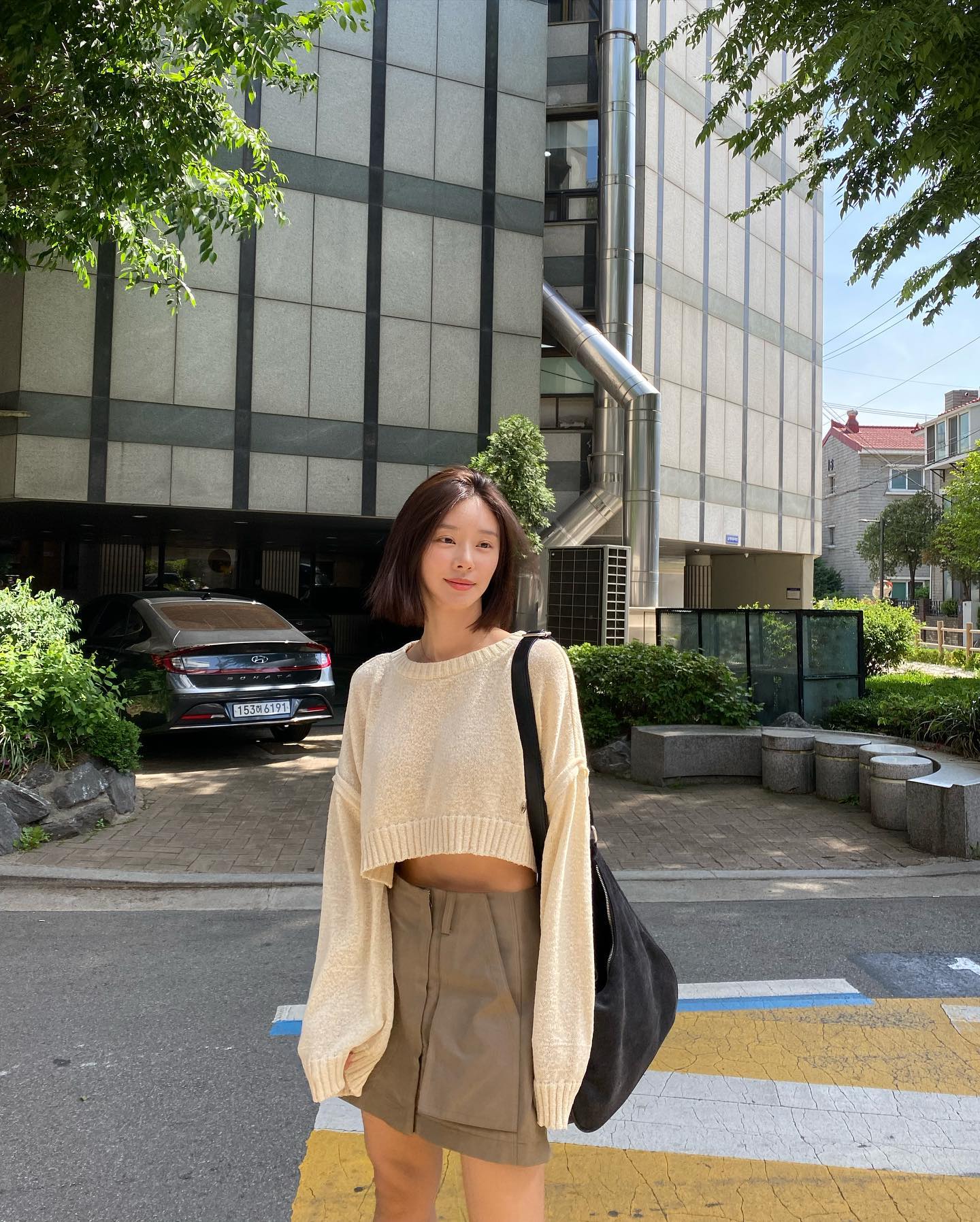 Màu sắc áo len cộc tay của Lee Joo Bin cũng khá đa dạng, từ các gam trung tính như trắng, be, xám cho đến những tông màu pastel nhẹ nhàng. Khi kết hợp cùng quần cạp cao hoặc chân váy mini, áo len cộc tay giúp cô trông gọn gàng, thanh thoát và trẻ trung hơn tuổi thật.