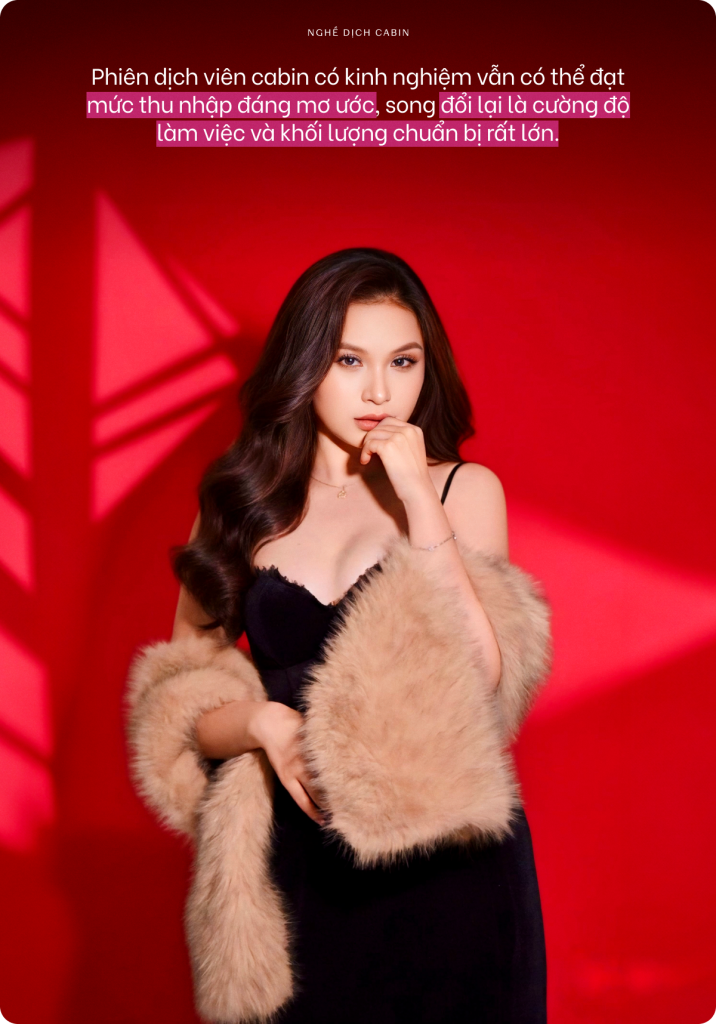 “Với phiên dịch viên cabin có kinh nghiệm, mức phí thường dao động từ 300 - 800 USD/ngày (7 - 20 triệu đồng) tùy tính chất. Tuy nhiên, đằng sau một ngày đứng trên sân khấu hay trong cabin là một tuần nghiên cứu tài liệu ròng rã, standby từ rất sớm để xem trước flow chương trình”, nữ phiên dịch viên chia sẻ.