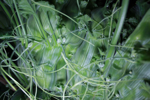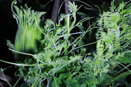 Những chiếc lá đều tăm tắp chỉ mọc phía thân trên của dây được người dân tưởng tượng như vây rồng. Cây bí phân tách thành 3 ngọn với “râu rồng” và “hàm răng” độc đáo.