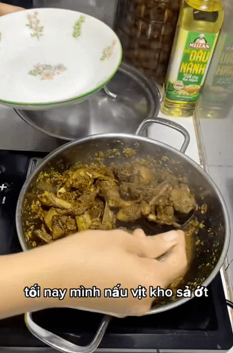 "Có hôm mình mua 60k vịt, nấu vịt kho sả ớt ăn được hai bữa. Một phần ăn tối, phần còn lại để sáng mai. Thêm 4 nghìn đậu đũa nấu canh, và ít rau luộc là xong. Mình cũng cố gắng thay đổi các món để 2 con ăn ngon mà không chán".