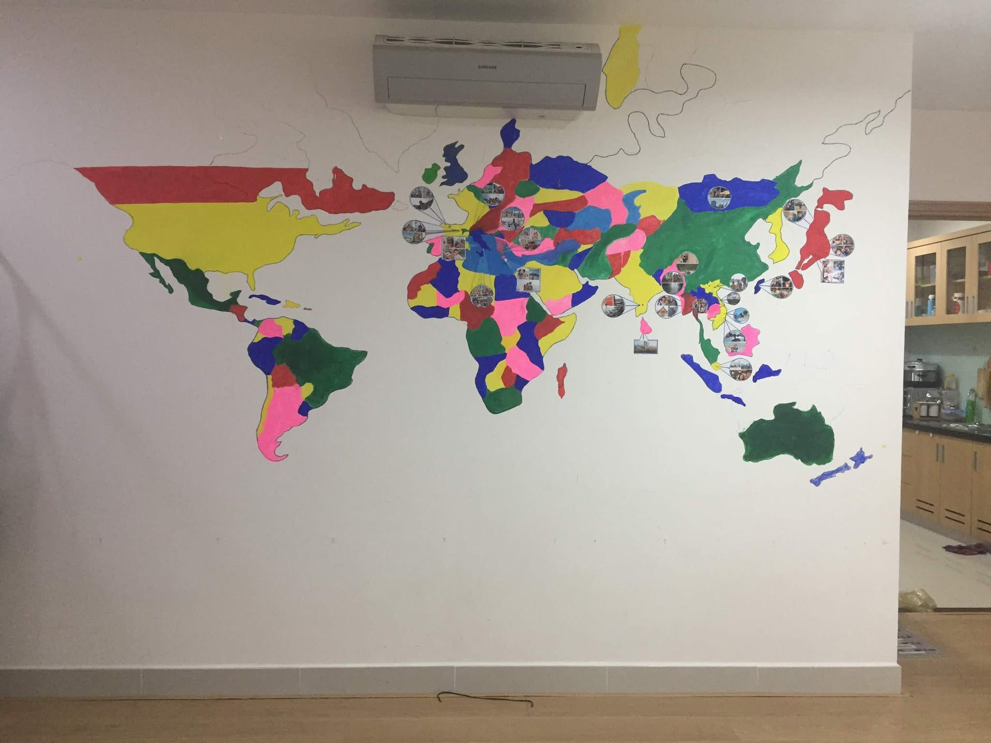 Bước 1: Giúp con hình dung một thế giới rộng lớn: các châu lục, các đại dương (câu chuyện đi vòng quanh thế giới của các nhà thám hiểm), các quốc gia nổi tiếng, sự ảnh hưởng của khí hậu đến đất đai, đời sống của dân cư (ví dụ người da đen do ở gần xích đạo), các thể loại top: top 5 quốc gia đông dân, top 5 quốc gia có diện tích lớn, top 5 các quốc gia giàu có, và các kỳ quan nổi tiếng. Tất cả đều được vẽ trực tiếp vào tường cho dễ nhớ.