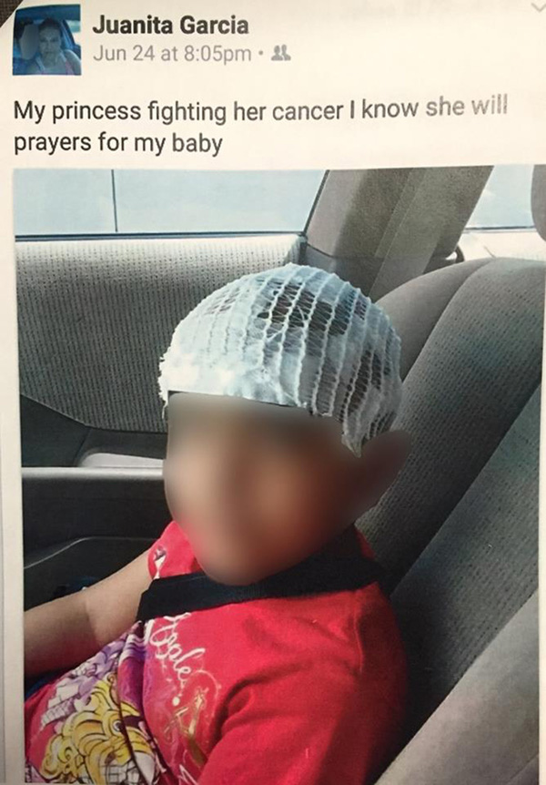 Juanita Garcia đã cạo đầu, bắt đứa con gái khỏe mạnh của mình mặc quần áo của người bị mắc bệnh ung thư rồi chụp ảnh đưa lên mạng để kiếm tiền ủng hộ từ những tấm lòng hảo tâm. Cô ta đăng trên các trang mạng rằng đứa con gái 7 tuổi của mình chỉ sống được vài tháng nữa vì bé bị chuẩn đoán mắc bệnh ung thư giai đoạn cuối và gia đình đang rất cần có tiền chữa trị.