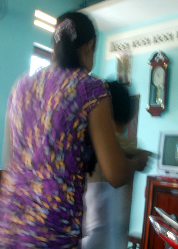 | Bà Cúc đang lôi con con ra đánh. Ảnh: Trí Tín. |