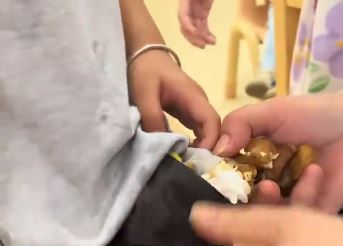 Theo đó, vào ngày 12/9, một giáo viên mầm non phát hiện túi quần của một cậu bé trong lớp bị ướt và bóng giống như bị đổ dầu lên. Cô giáo vội ra kiểm tra trang phục của học sinh thì ngỡ ngàng phát hiện, túi quần của em nhét đầy cơm và thịt.