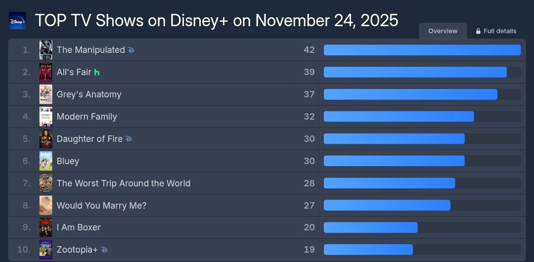 Theo số liệu từ FlixPatrol, The Manipulated đã vươn lên dẫn đầu bảng xếp hạng nội dung được xem nhiều nhất trên Disney+ toàn cầu vào ngày 24/11. Đáng chú ý, bộ phim thậm chí còn vượt qua đối thủ nổi bật All’s Fair, tác phẩm pháp lý gây chú ý với sự tham gia của Kim Kardashian. Không chỉ tạo dấu ấn tại thị trường quốc tế, bộ phim 18+ tiếp tục duy trì phong độ ấn tượng tại châu Á khi giữ vị trí số 1 ở Hàn Quốc và Đài Loan, đồng thời góp mặt trong top 10 tại các thị trường Hong Kong, Singapore và Thổ Nhĩ Kỳ.