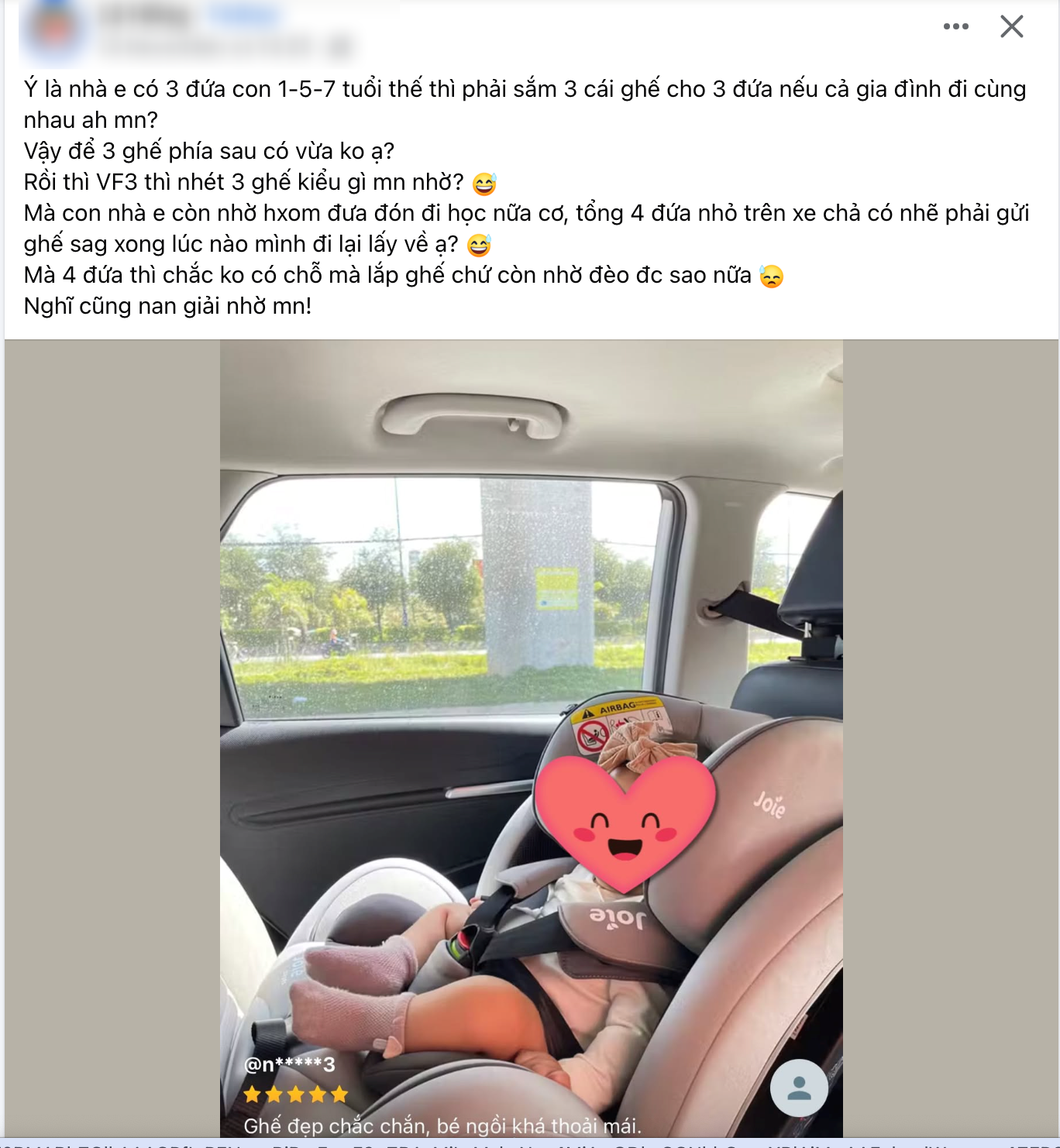 Chị L.H. bày tỏ thắc mắc, "Nhà em có 3 đứa nhỏ 1-5-7 tuổi thì phải sắm 3 cái ghế cho 3 đứa nếu cả gia đình đi cùng nhau à mọi người. Vậy để 3 ghế phái sau có vừa không ạ? Rồi thì VF3 thì nhét 3 ghế kiểu gì mọi người nhở.