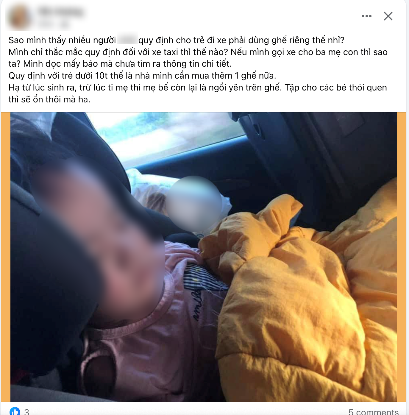 "Sao mình thấy nhiều người phản đối quy định cho trẻ đi xe phải dùng ghế riêng thế nhỉ? Mình chỉ thắc mắc quy định mới với xe taxi thì thế nào? Nếu mình gọi xe cho ba mẹ con thì sao ta. Mình đọc mấy báo mà chưa tìm ra thông tin chi tiết. Quy định với trẻ em dưới 10 tuổi thế là nhà mình cần mua thêm 1 ghế nữa. H. từ lúc sinh ra trừ lúc ti mẹ thì mẹ bế còn lại là ngồi yên trên ghế. Tập cho các bé thói quen thì sẽ ổn thôi mà ha", chị Y.H chia sẻ.