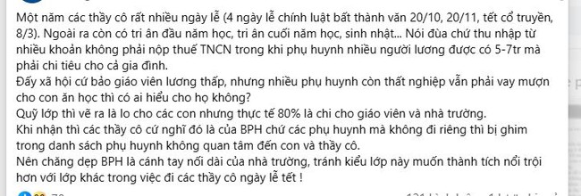 Mới đây, một bài đăng của phụ huynh Hà Nội trên mạng xã hội đã tiếp tục làm dậy sóng dư luận. Người này cho rằng trong một năm, giáo viên có quá nhiều dịp được "tri ân", từ 20/10, 20/11, 8/3 cho đến các dịp tổng kết, khai giảng hay sinh nhật. Theo phụ huynh này, nếu cộng tất cả lại, số tiền mà mỗi lớp chi cho giáo viên không hề nhỏ, trong khi nhiều gia đình chỉ có thu nhập 5 đến 7 triệu đồng mỗi tháng nhưng vẫn phải gồng gánh chi phí học tập và sinh hoạt.