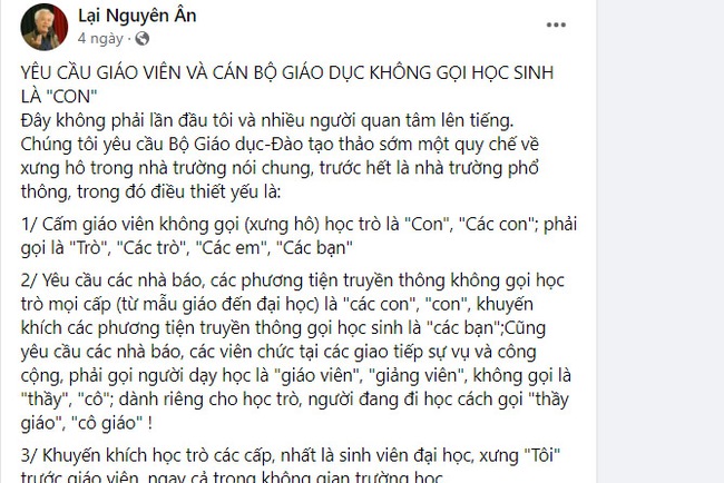 Khi đó, ông Lại Nguyên Ân cho rằng việc gọi học sinh là "con" và để học sinh gọi giáo viên là "cô, thầy" khiến ranh giới giữa mối quan hệ nghề nghiệp và quan hệ gia đình bị nhập nhằng. Theo ông, cách xưng hô này có thể khiến người dạy dễ rơi vào cảm xúc chủ quan, thậm chí dẫn tới các hành vi vượt giới hạn trong môi trường giáo dục.