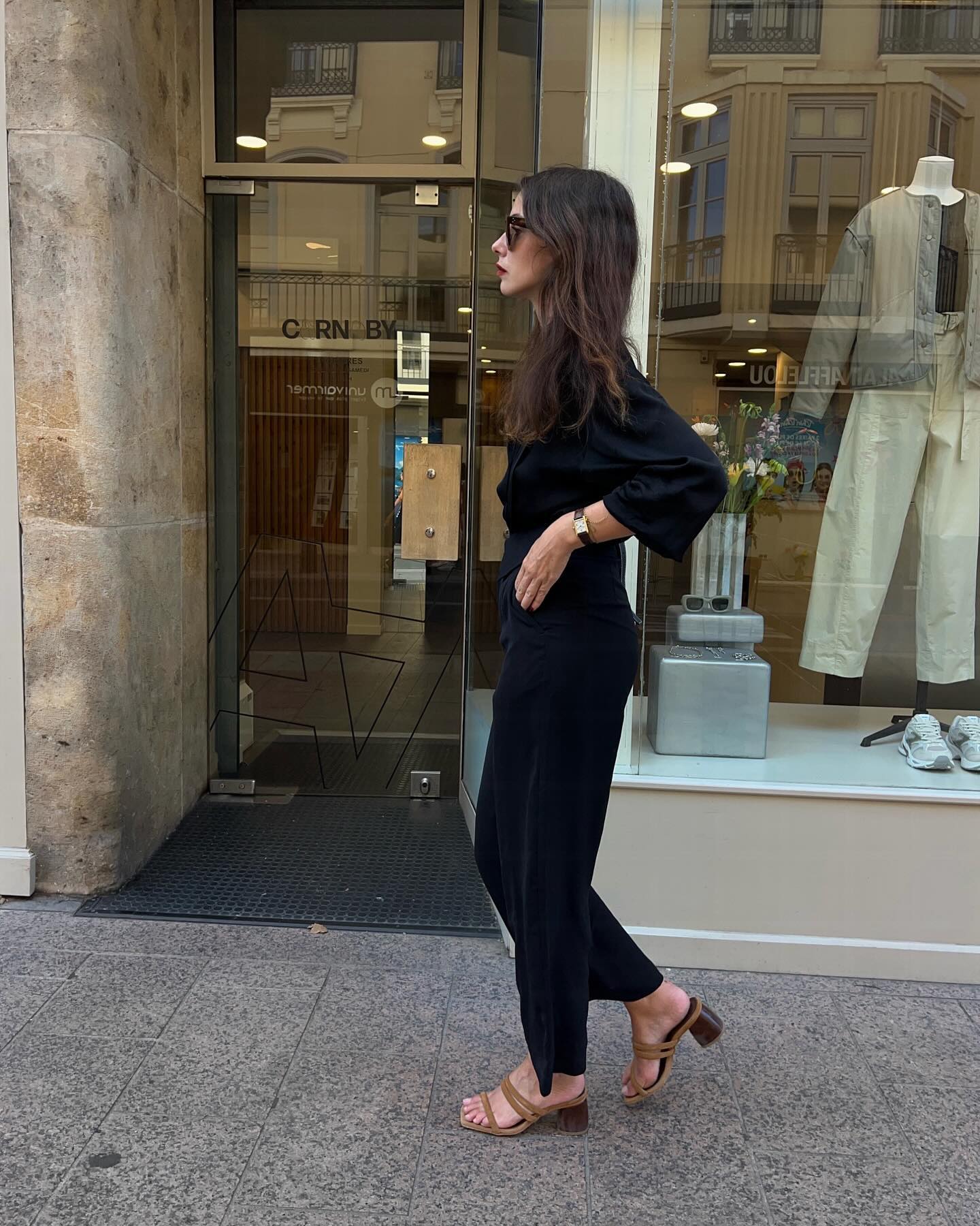 Trong các outfit thường ngày, sandal mule thường được phối cùng quần jeans ống thẳng, chân váy midi hoặc váy cotton đơn giản. Tổng thể trang phục trông rất tự nhiên, đúng tinh thần thời trang Pháp: không quá cầu kỳ nhưng vẫn tinh tế.