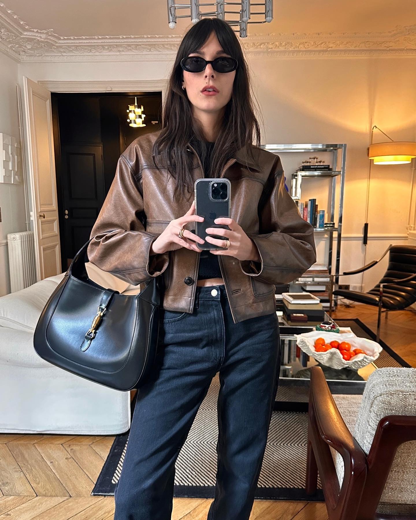 Trái ngược với vẻ mềm mại của áo dạ, áo khoác da mang đến cho phụ nữ Pháp nét cá tính và phóng khoáng. Tuy nhiên, họ không chọn những thiết kế quá hầm hố hay nhiều chi tiết kim loại, mà ưu tiên áo khoác da trơn, phom dáng gọn gàng, màu đen hoặc nâu sẫm.