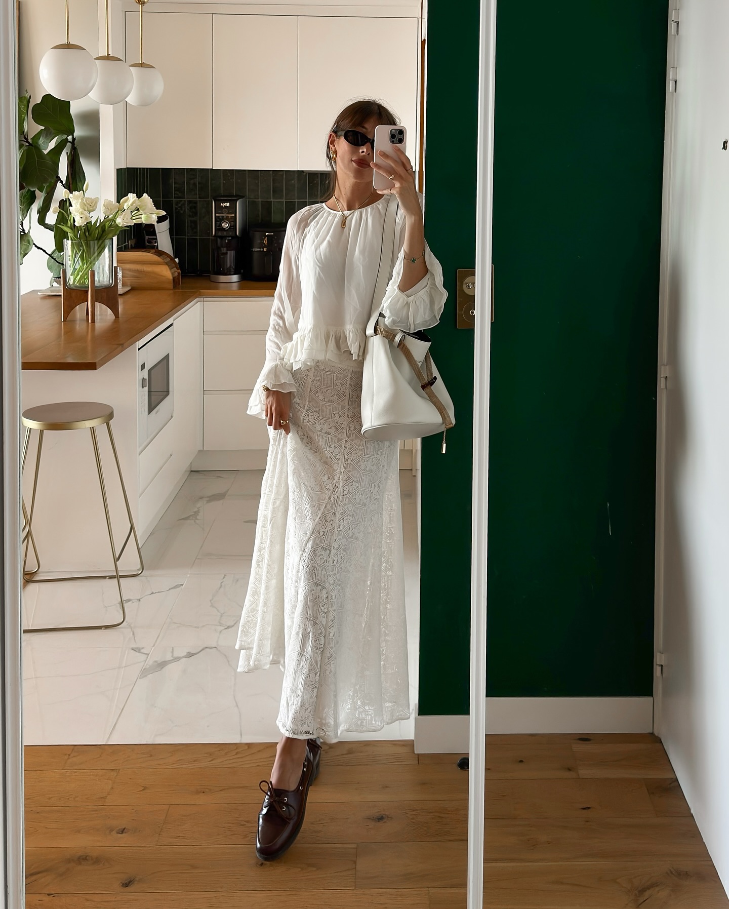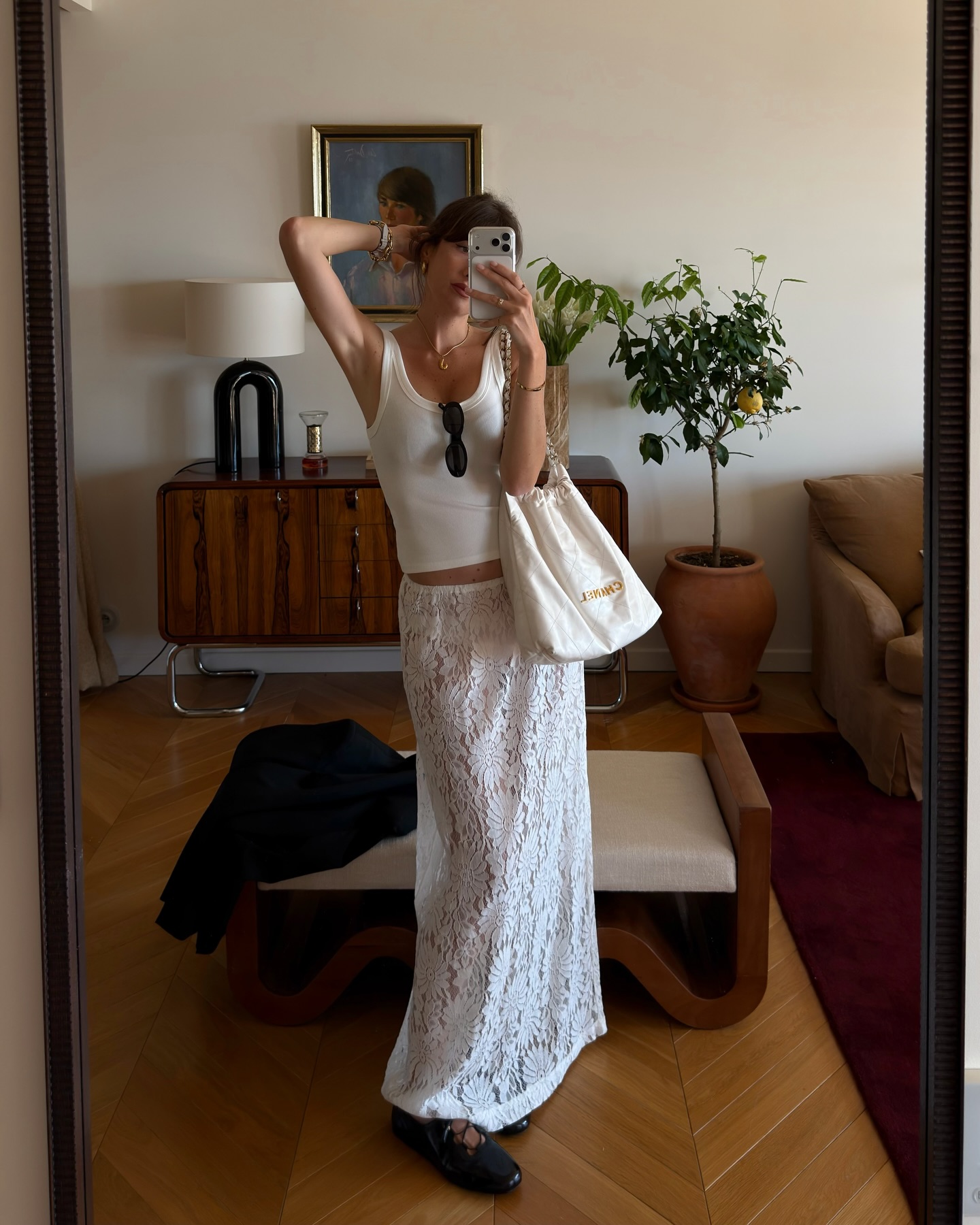 Không có gì gợi cảm giác mùa hè rõ ràng hơn một chiếc chân váy trắng. Phụ nữ Pháp yêu thích item này vì sự tươi sáng, nhẹ nhàng và khả năng "làm mát" thị giác trong những ngày nắng nóng.