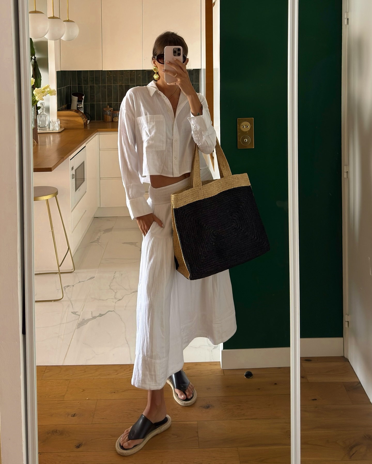 Một mẹo nhỏ trong cách mặc của họ là luôn giữ tổng thể hài hòa: nếu chân váy đã ngắn, phần trên sẽ kín đáo hơn. Điều này giúp bộ trang phục vẫn giữ được nét thanh lịch đặc trưng. Thêm một chiếc túi cói hoặc kính râm là đủ để tạo nên vẻ ngoài đậm chất mùa hè.