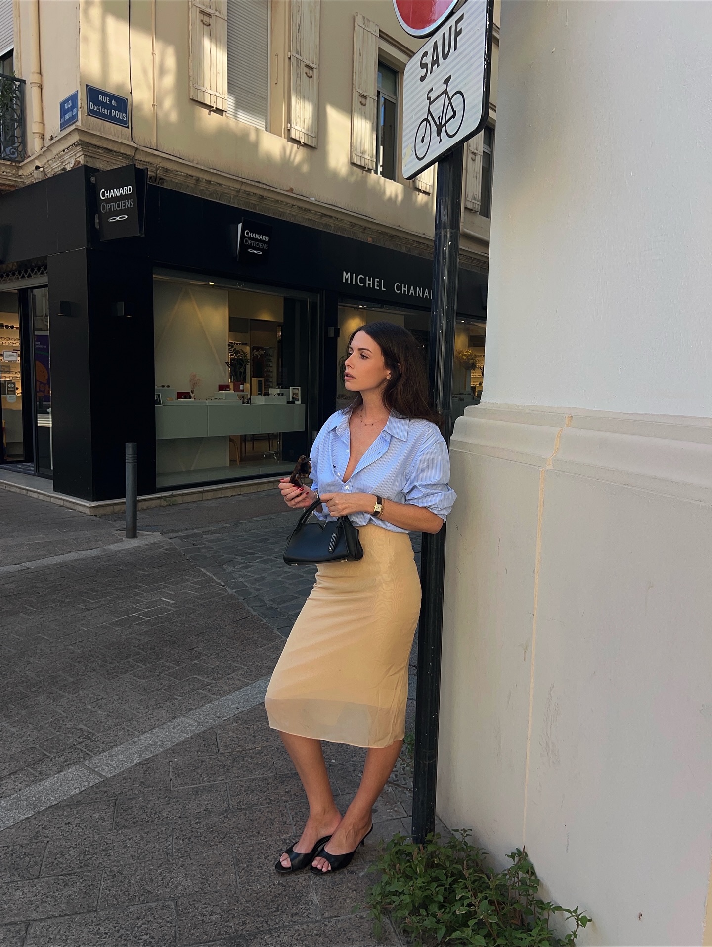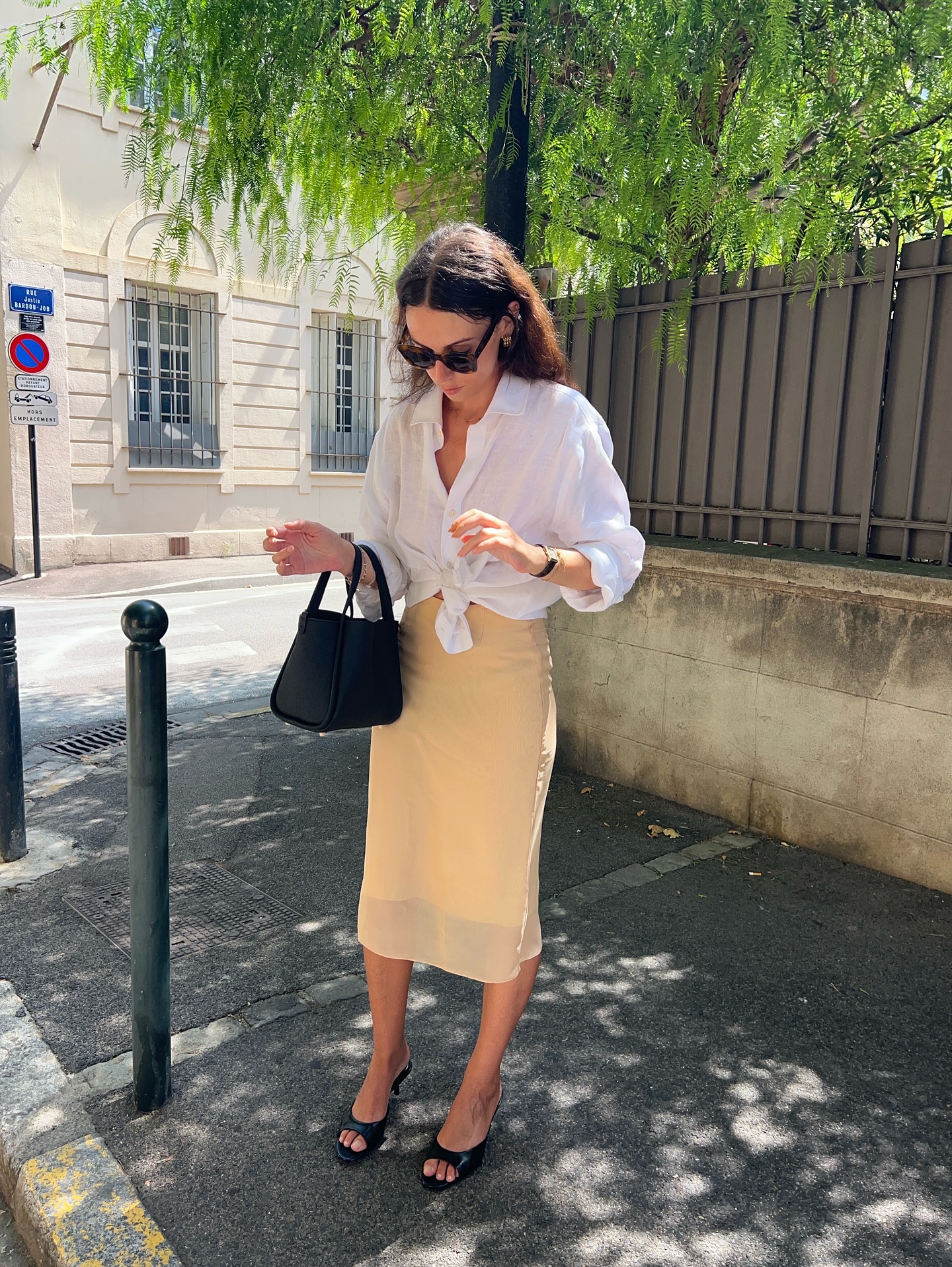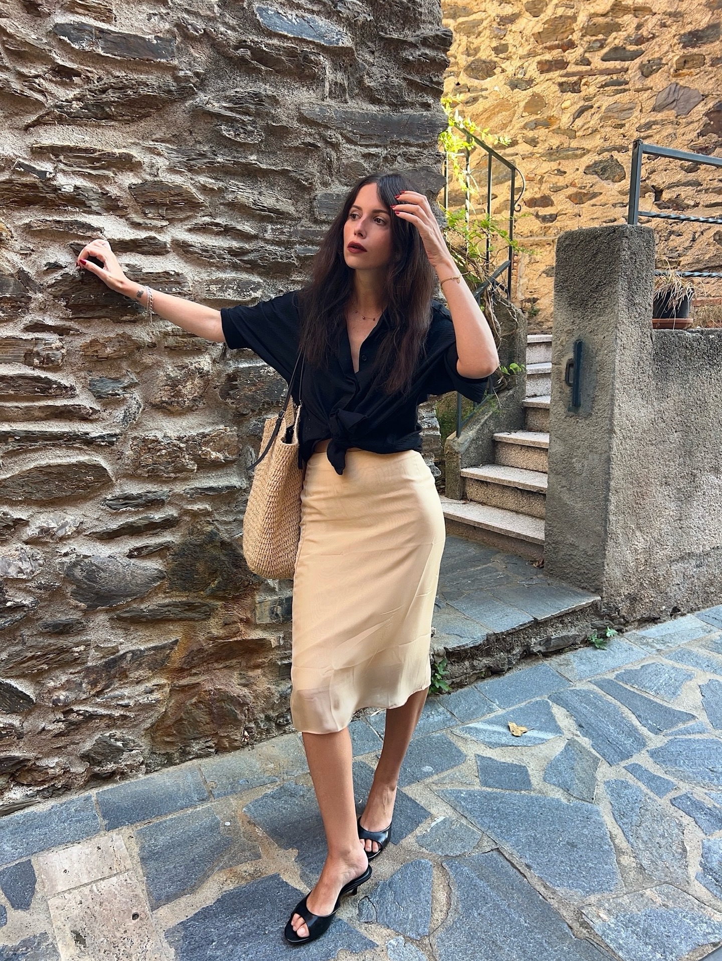 Phụ nữ Pháp thường kết hợp chân váy lụa với áo thun basic hoặc áo hai dây đơn giản. Cách phối này tạo nên sự cân bằng giữa vẻ sang trọng của chất liệu và sự phóng khoáng của trang phục. Một đôi sandal mảnh hoặc giày bệt là đủ để hoàn thiện set đồ mà không cần thêm thắt quá nhiều phụ kiện.