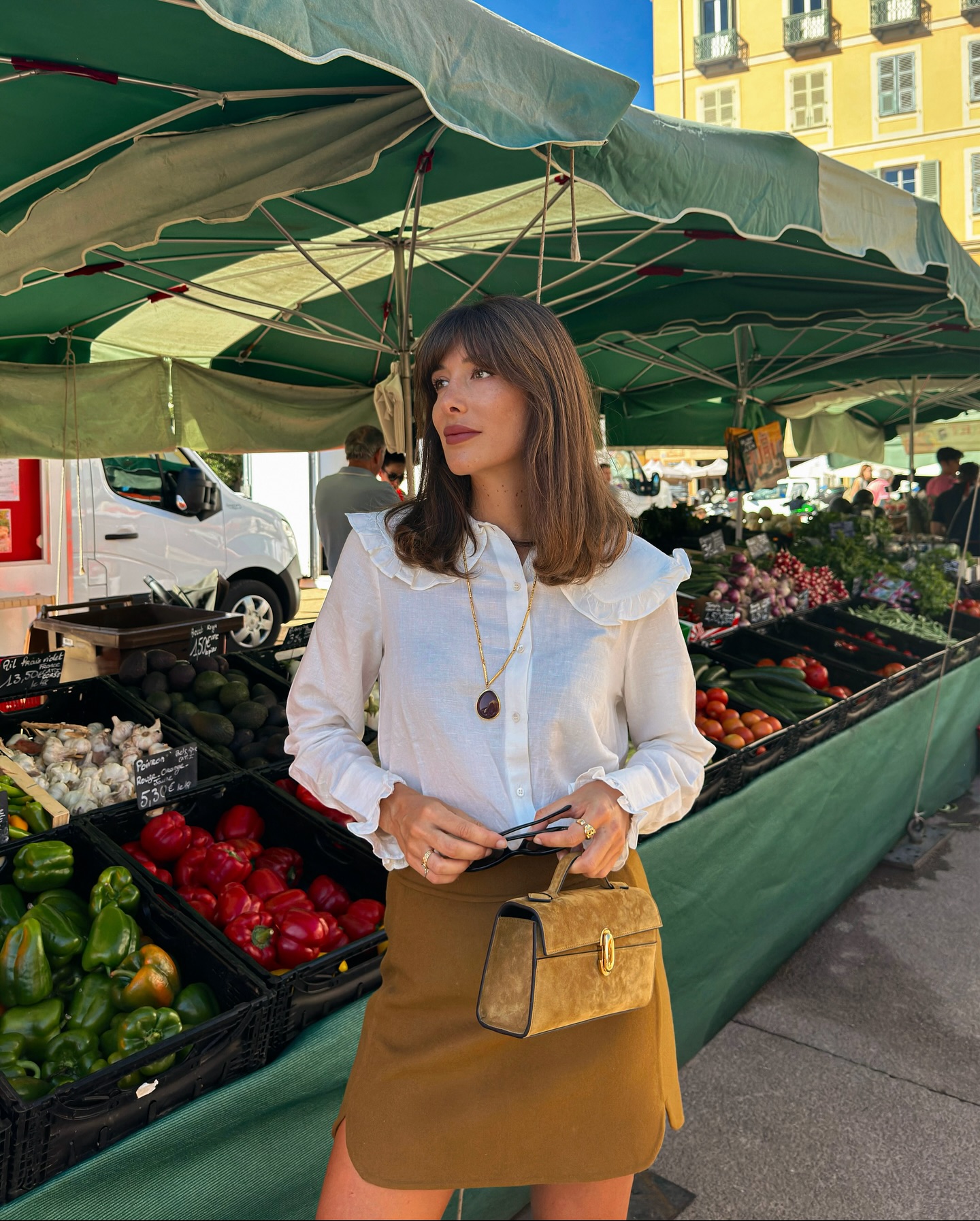Chất liệu được ưa chuộng là denim, cotton hoặc vải kaki. Những chiếc chân váy này thường có thiết kế đơn giản, ít chi tiết, tập trung vào form dáng gọn gàng. Phụ nữ Pháp thường phối chân váy ngắn với áo sơ mi oversized hoặc áo blouse nhẹ nhàng, tạo nên sự đối lập thú vị giữa kín đáo và phóng khoáng.