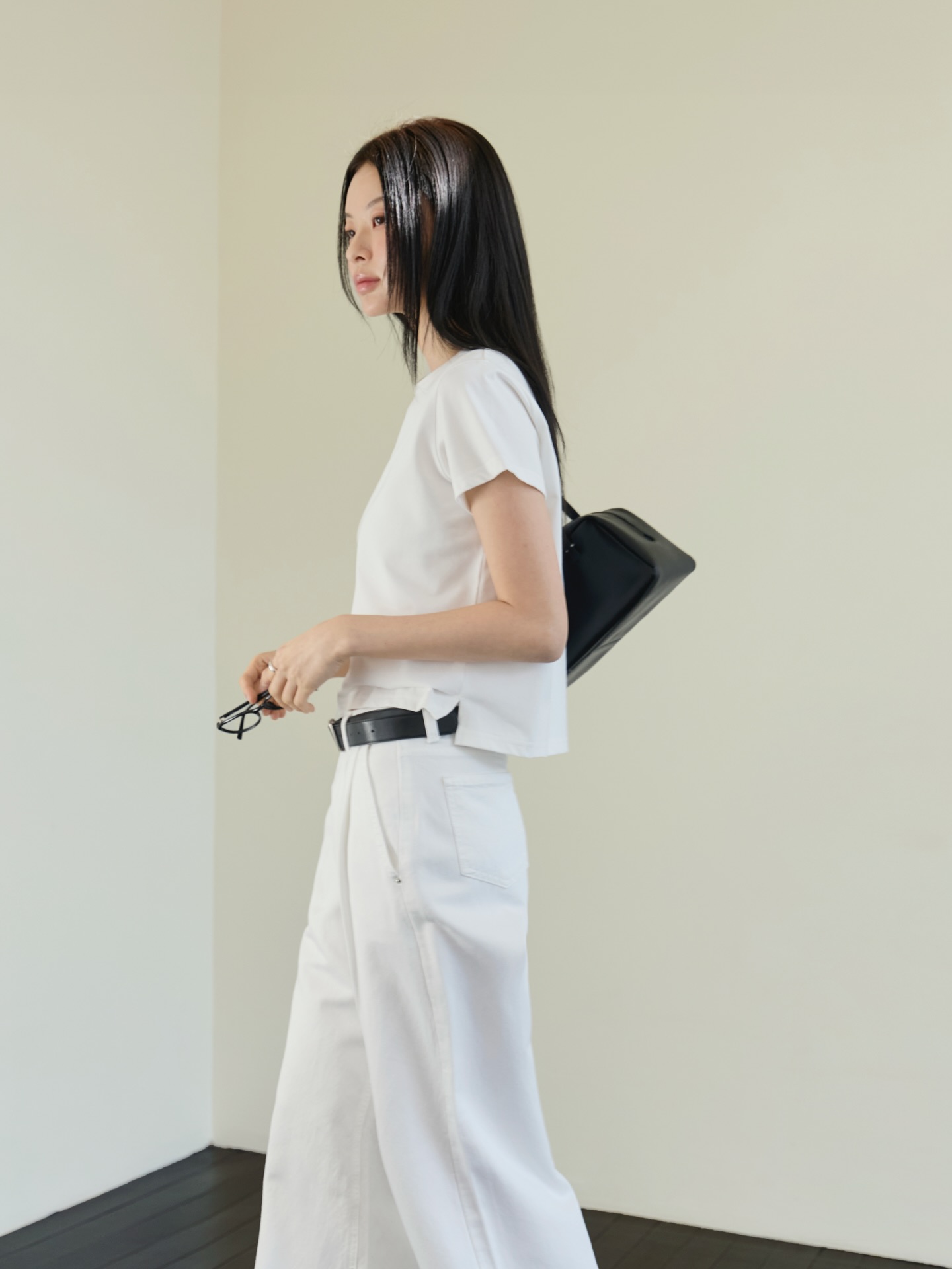 Trong khi đó, quần trắng kết hợp với áo thun trắng sẽ tạo nên một outfit "all white" đầy tinh tế. Bí quyết ở đây là chú ý đến chất liệu và sắc độ – ví dụ như kết hợp trắng tinh với trắng ngà để tạo chiều sâu cho trang phục.