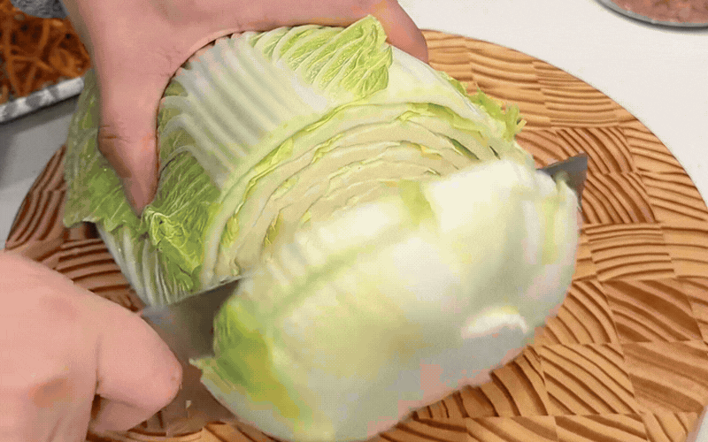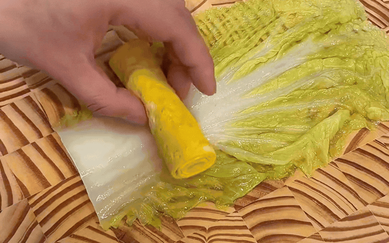 Khi mọi nguyên liệu đã sẵn sàng trên mặt bếp, công đoạn cuộn cải thảo lại giống như một trò chơi nghệ thuật đầy thư giãn. Trước tiên, bạn cắt bỏ bớt phần gốc cứng của bẹ cải thảo, nhẹ nhàng tách từng chiếc lá rồi đem trụng sơ qua nồi nước đang sôi sùng sục chừng mười giây ngắn ngủi.