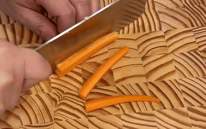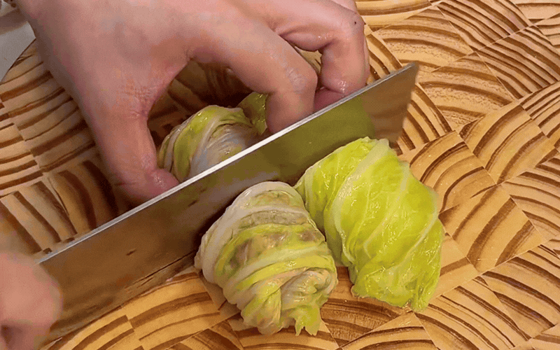 Cuộn thật chặt và đều tay cho đến khi hết sạch nguyên liệu, sau đó bạn dùng dao sắc cắt đôi các cuộn cải thảo ra để phô diễn trọn vẹn những đường vân ngũ sắc vô cùng nịnh mắt bên trong.